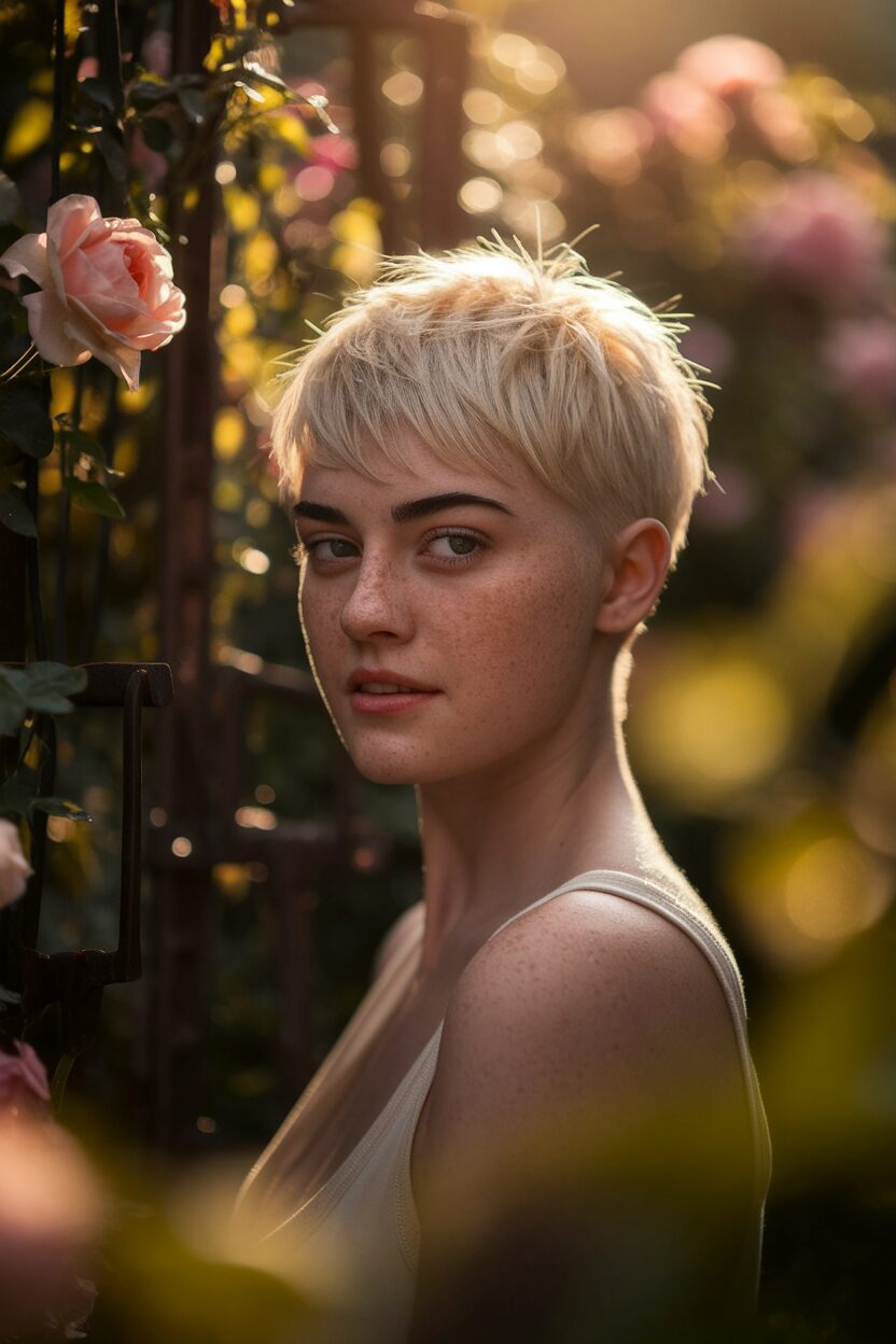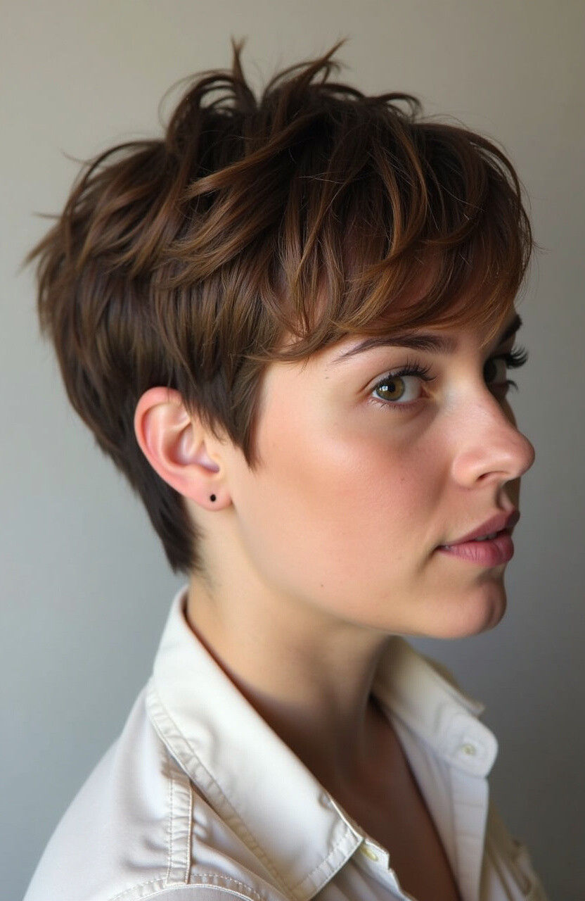 The shaggy pixie cut is all about texture and movement. It’s a bit longer on top, with layers that add dimension and volume.