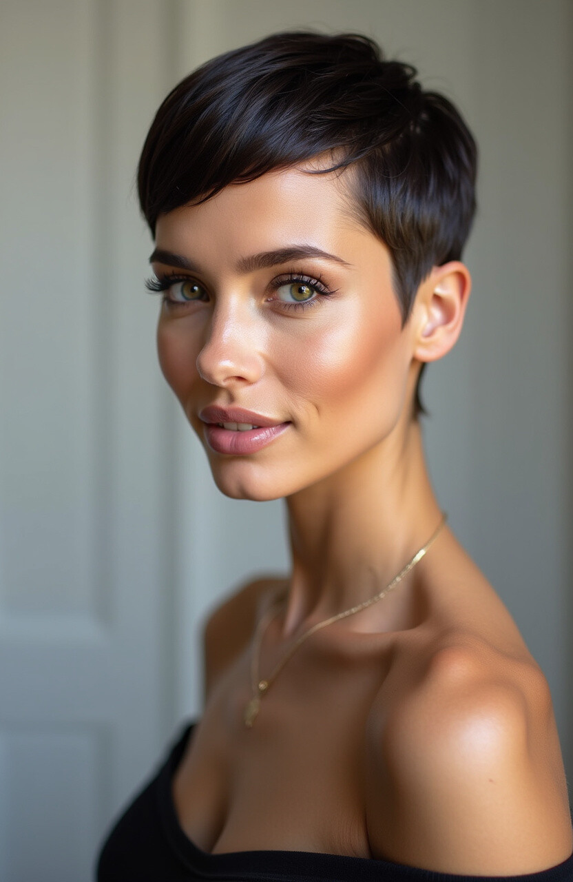 Use a flat iron and some shine serum to achieve that glossy finish. The sleek pixie is a timeless choice that never goes out of style.