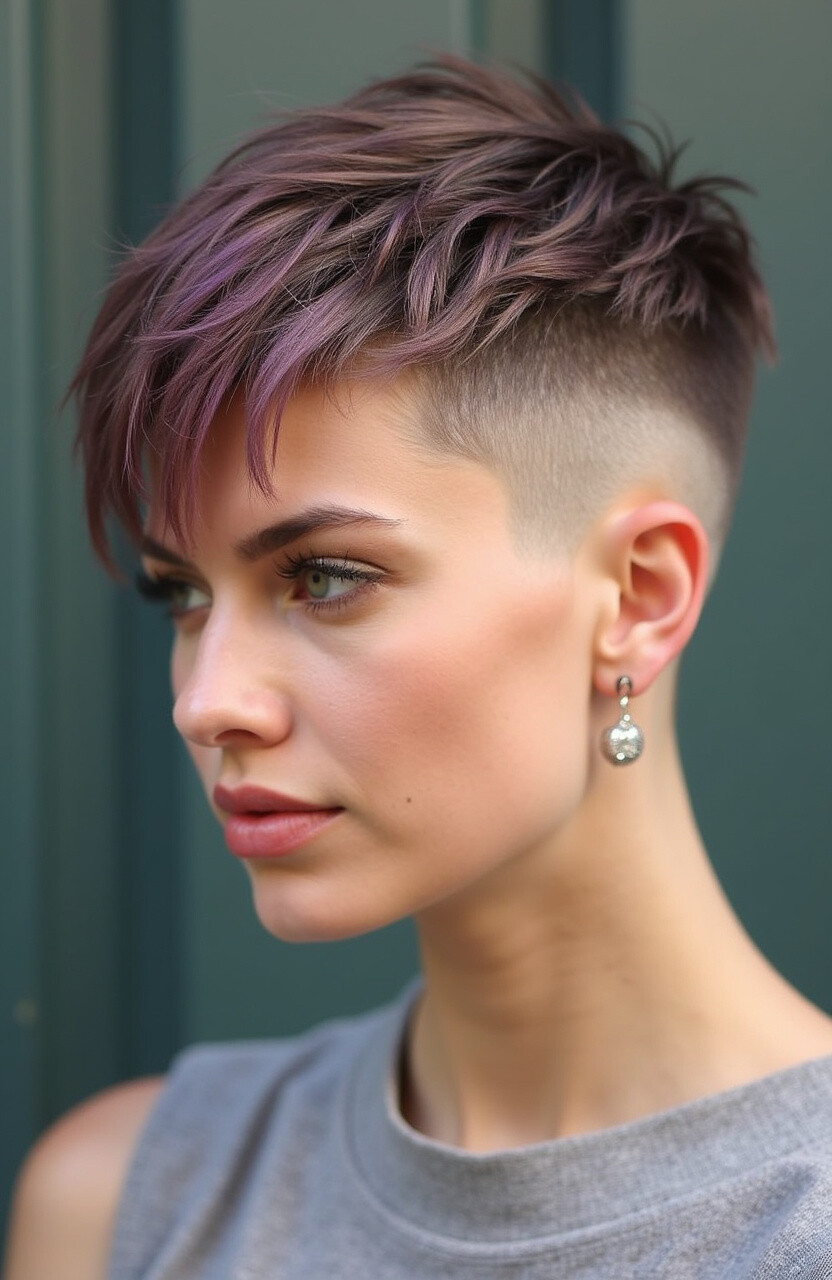 The contrast between the closely shaved sides and the longer top is striking. Side-swept bangs add a touch of femininity to the overall look.