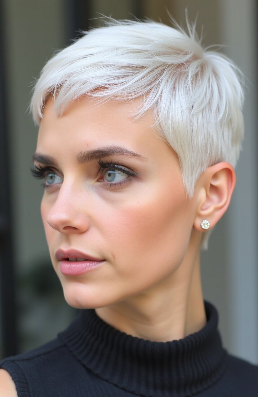 A platinum pixie cut is a real head-turner. The striking color adds a modern, chic vibe to your look.