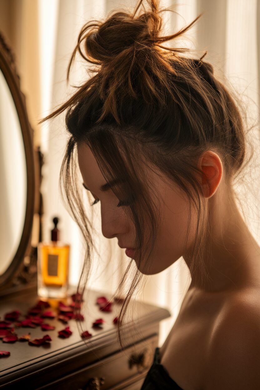 The messy bun with tendrils is perfect for those who love a laid-back yet stylish look. This hairstyle is both casual and elegant, featuring a loose bun with free-flowing tendrils framing your face.