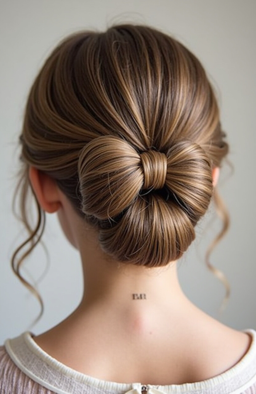 The elegant bow bun is a whimsical choice for those who want something different. The hair is styled into a bow shape, creating a playful yet elegant look.