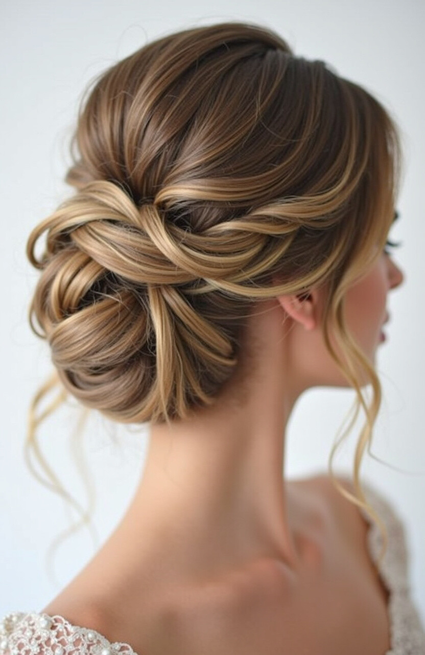 This updo is best achieved with practice or professional help. The result is a stunning blend of sophistication and creativity.