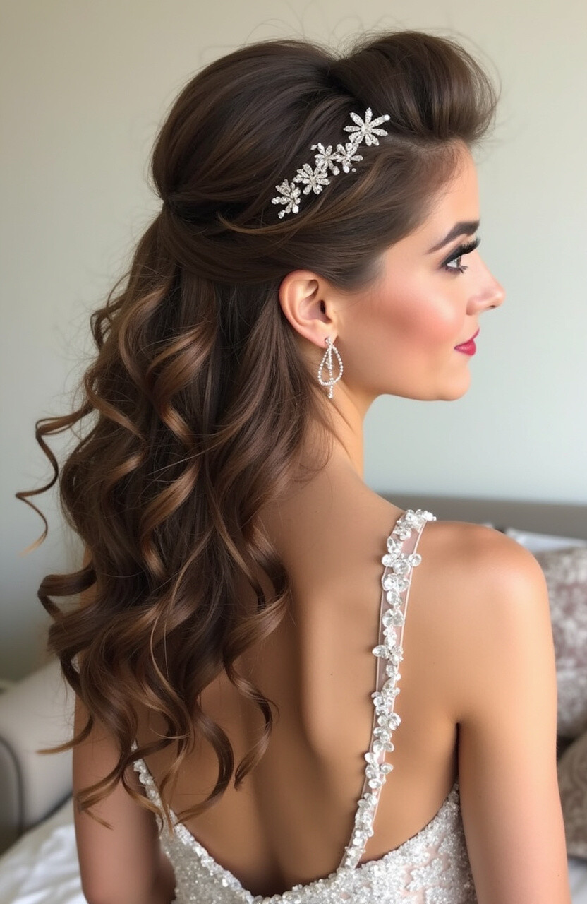 The half-up, half-down with curls is perfect for those who want the best of both worlds. This style features the top section pulled back, with the rest left in loose curls.