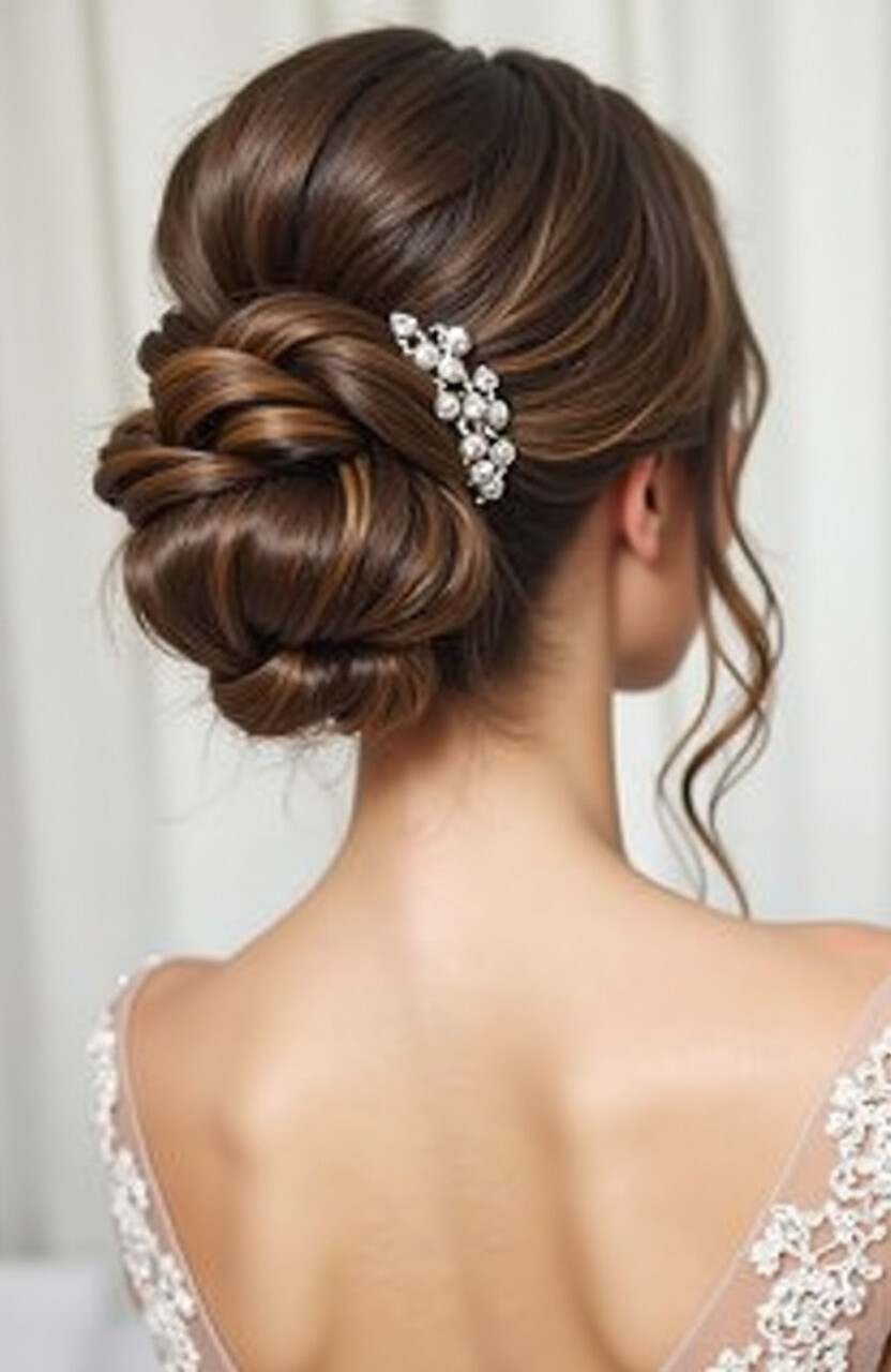 It’s a versatile style that pairs well with both strapless and high-neck dresses. Add a decorative comb to make it pop.