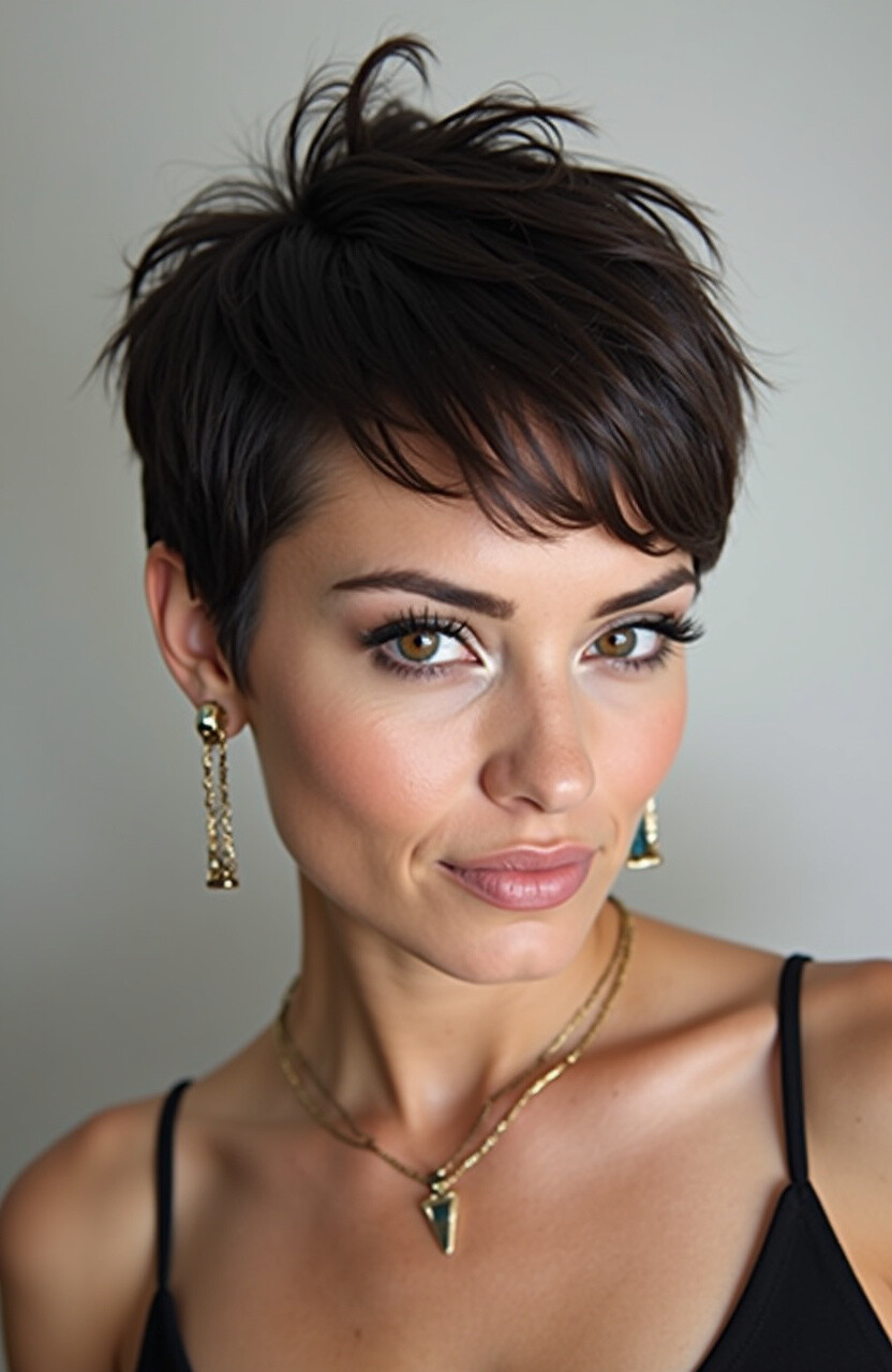 This pixie cut features longer bangs for a playful and flirty look. The razor cut adds texture and movement, making it a fun and easy style to wear. It’s perfect for those who want short hair with a twist.