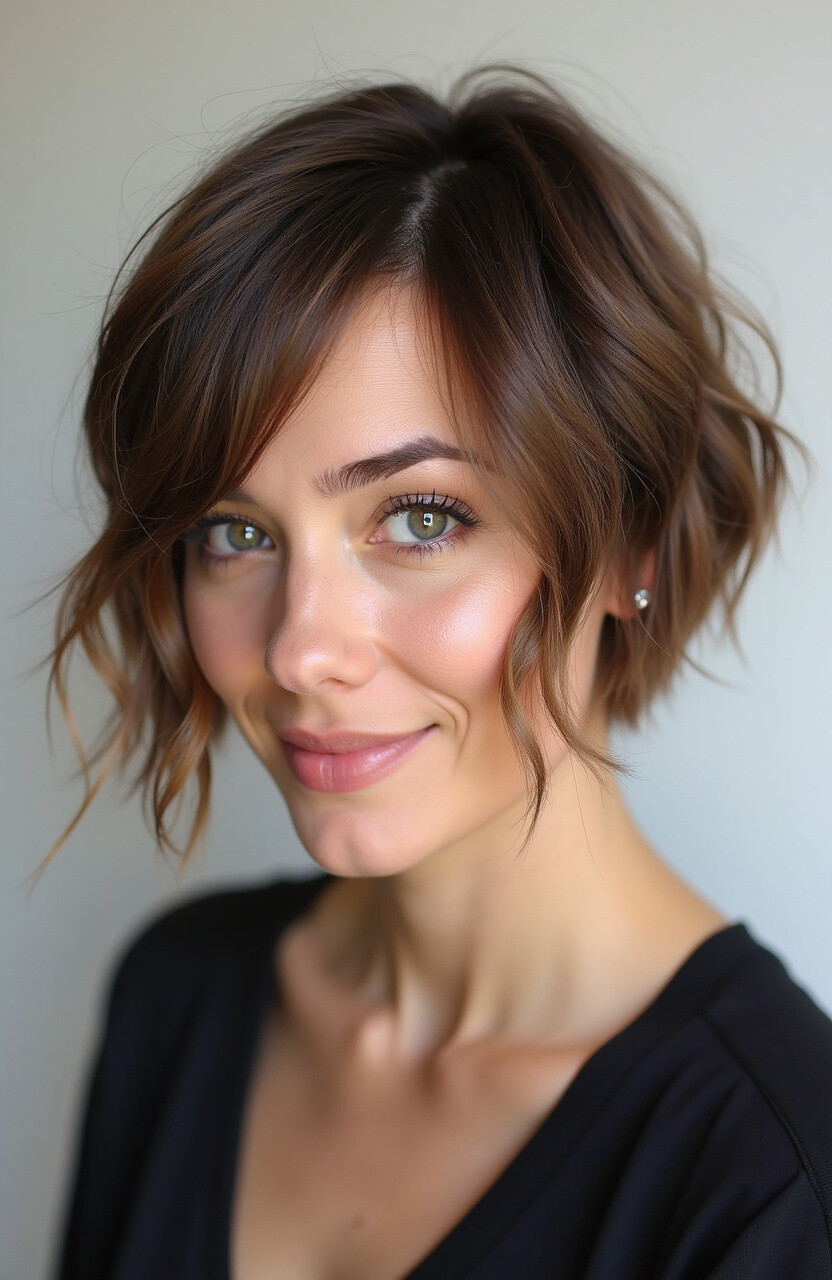 Keep the bangs long for a dramatic effect or sweep them to the side for versatility. It’s a youthful cut that adds a touch of whimsy.