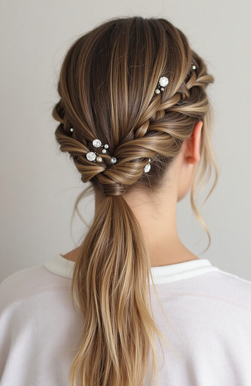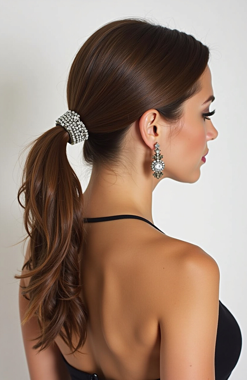 Elevate your ponytail with a touch of glamour using bejeweled accessories. Perfect for parties or special events, it’s dazzling and luxurious.
