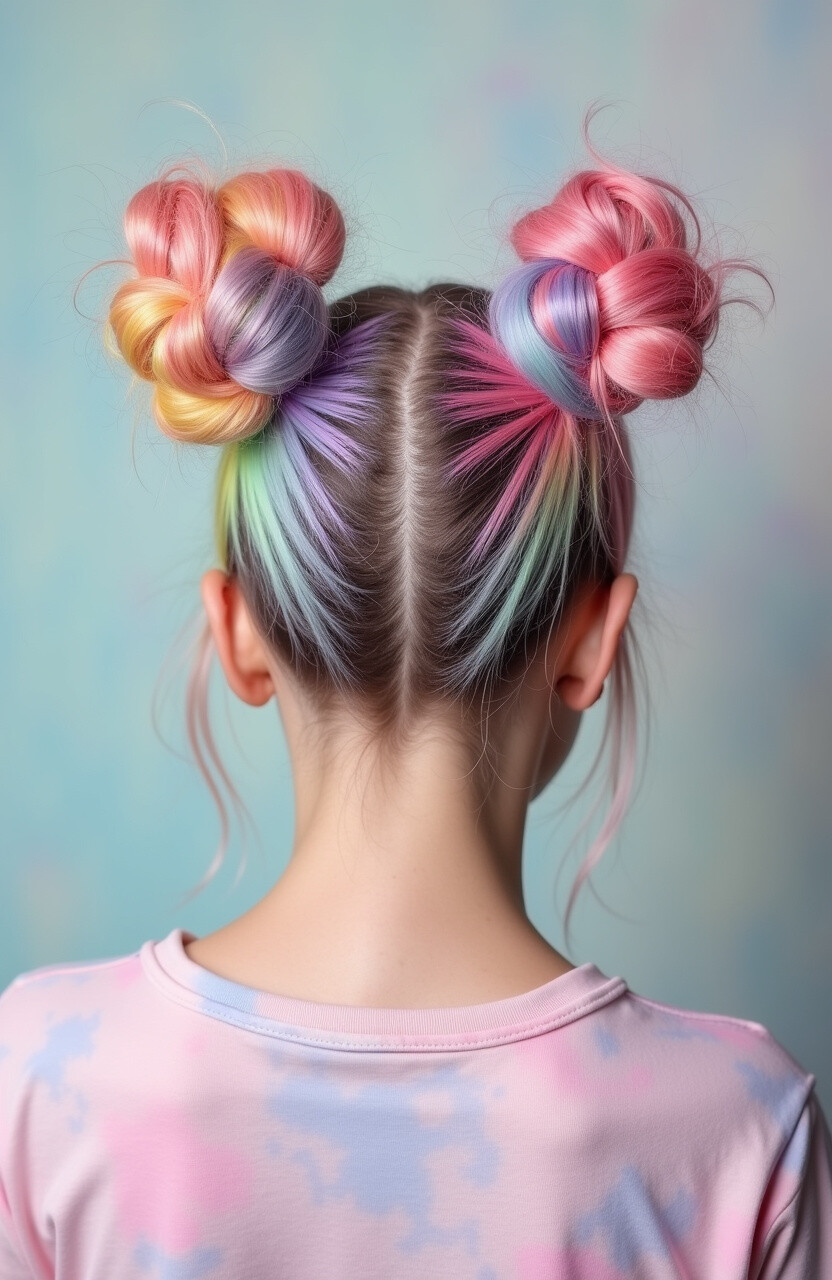 Turn your hair into a canvas with pastel rainbow space buns. Perfect for those who love to experiment with color.