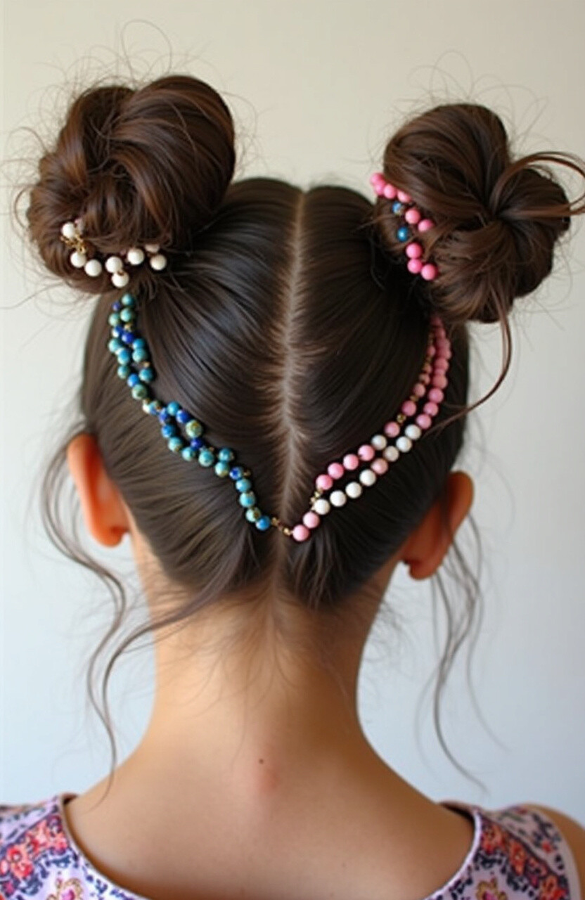 Decorate your space buns with colorful beads for a boho-chic look. It’s a fun way to add personality to your hairstyle.