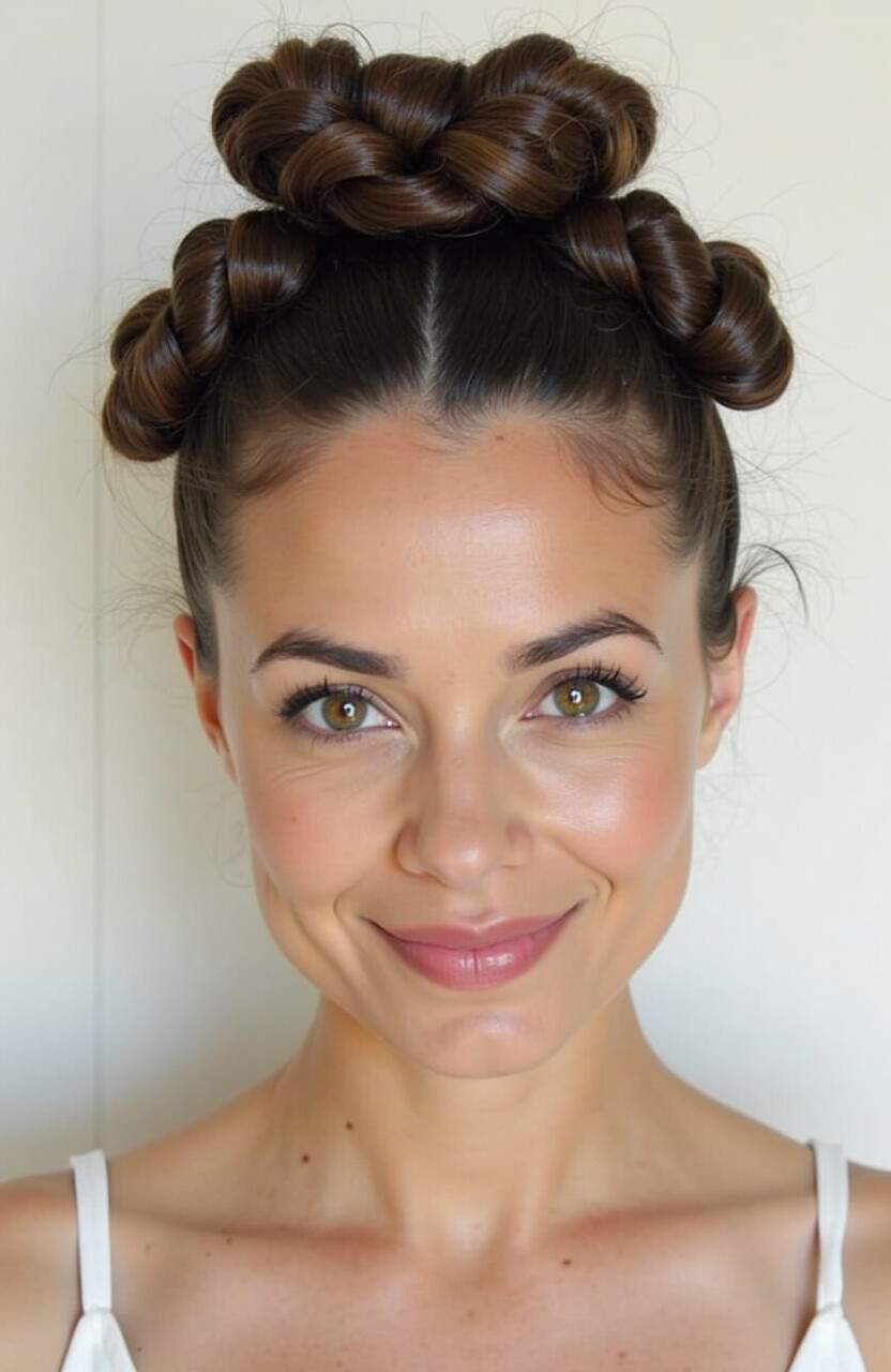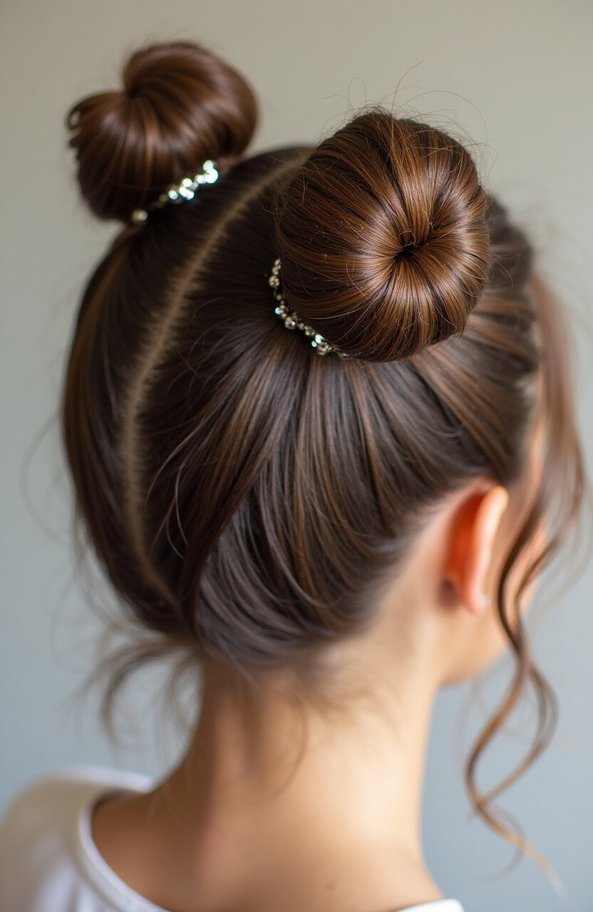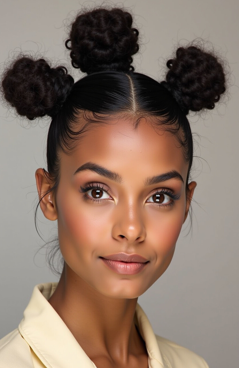 For a more polished look, sleek and shiny space buns are the way to go. Ideal for formal events or professional settings.