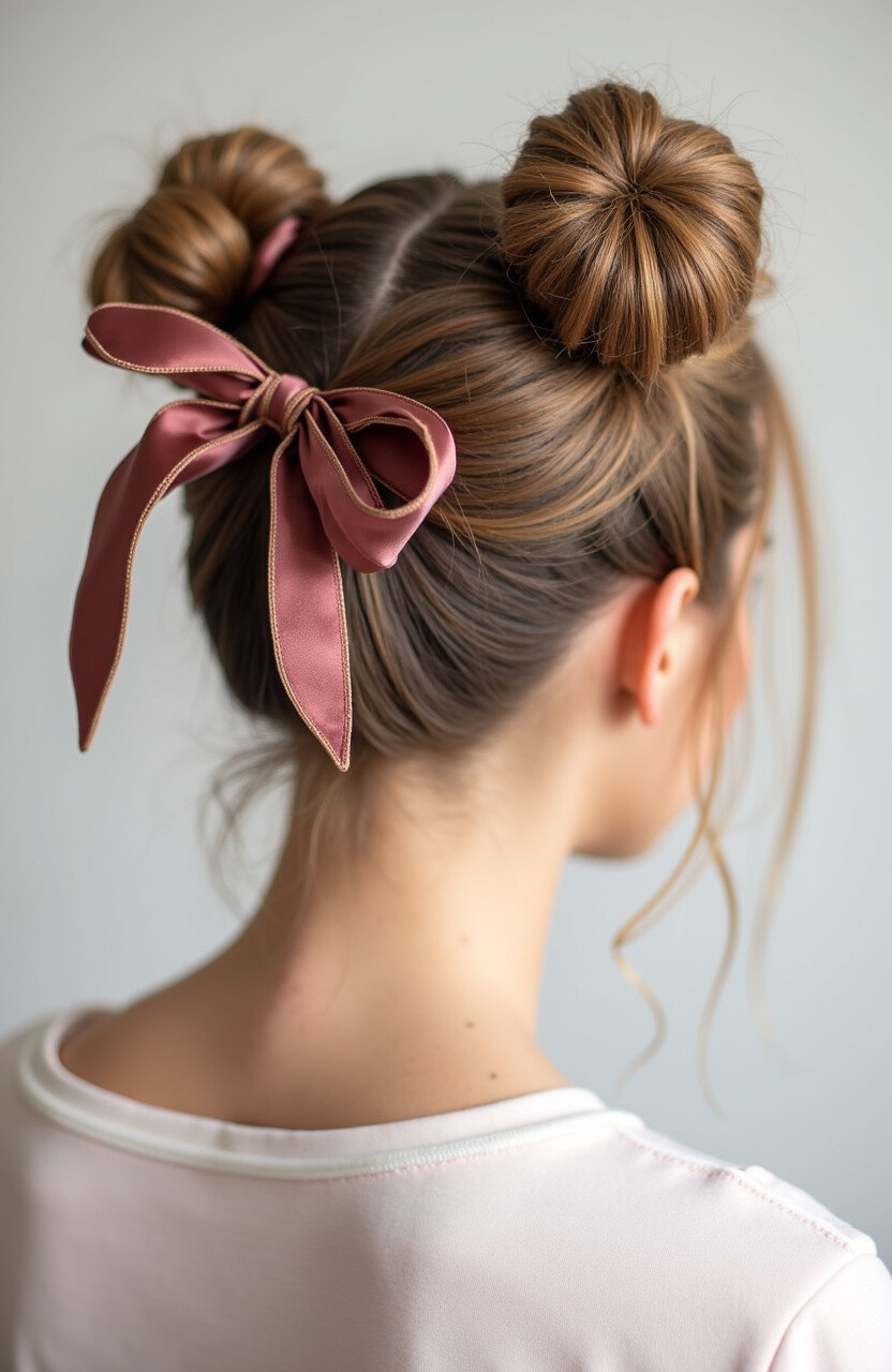 Knot the ribbon around each bun for a sweet and feminine look. It’s a simple way to elevate your hairstyle.