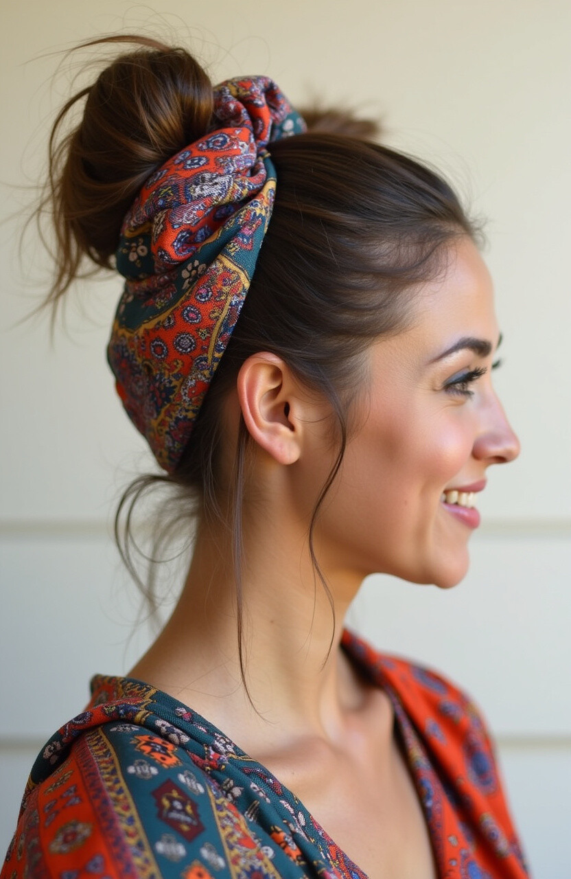 Wrap a colorful scarf around your space buns for a bohemian twist. It’s a great way to add personality to your hairstyle.
