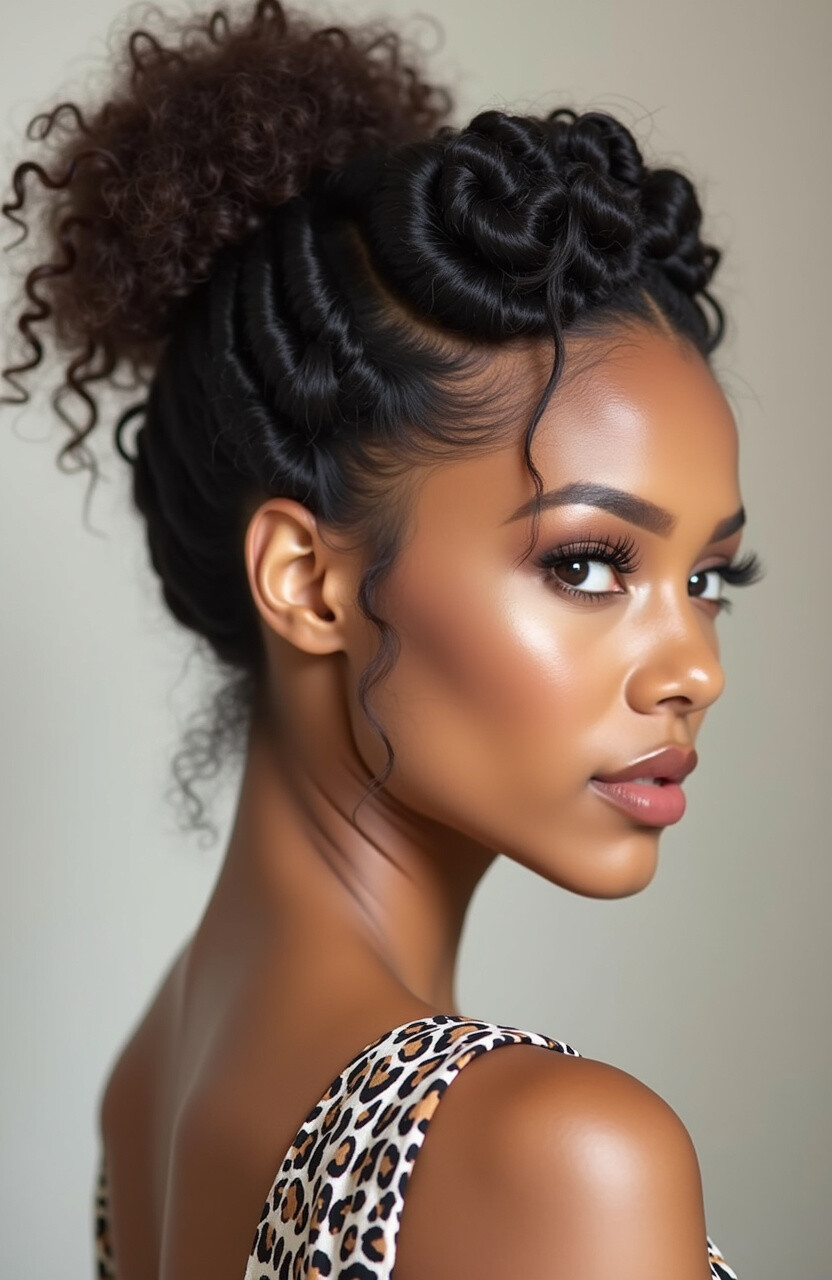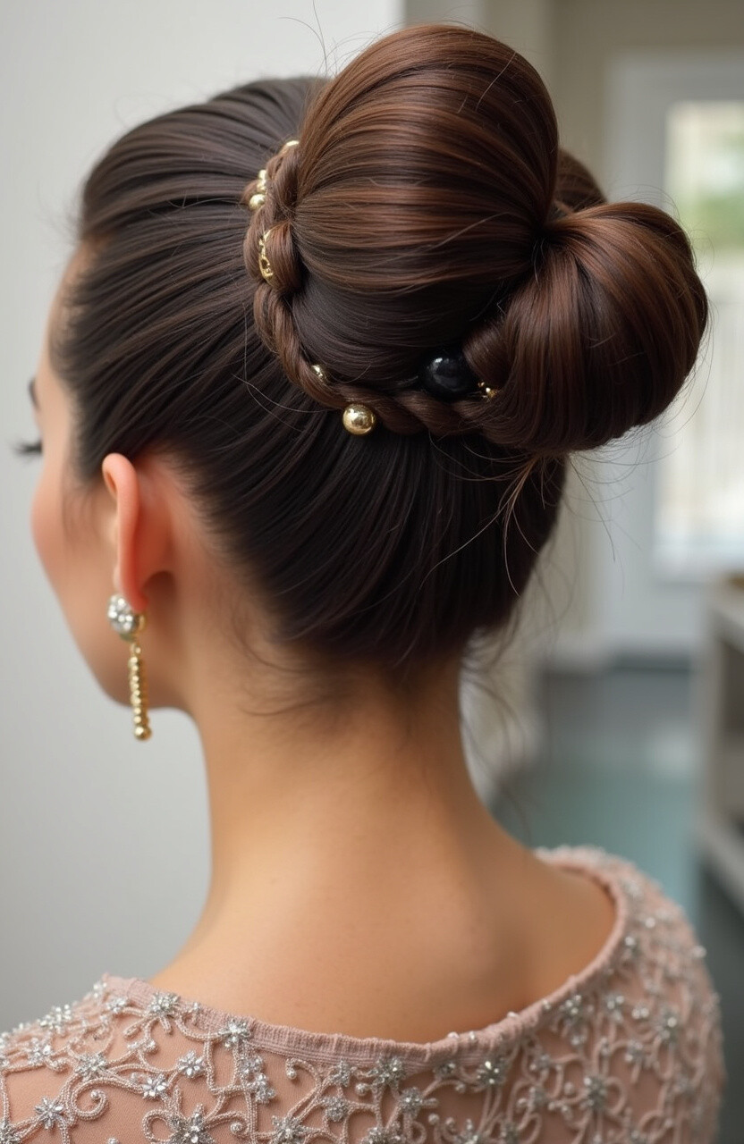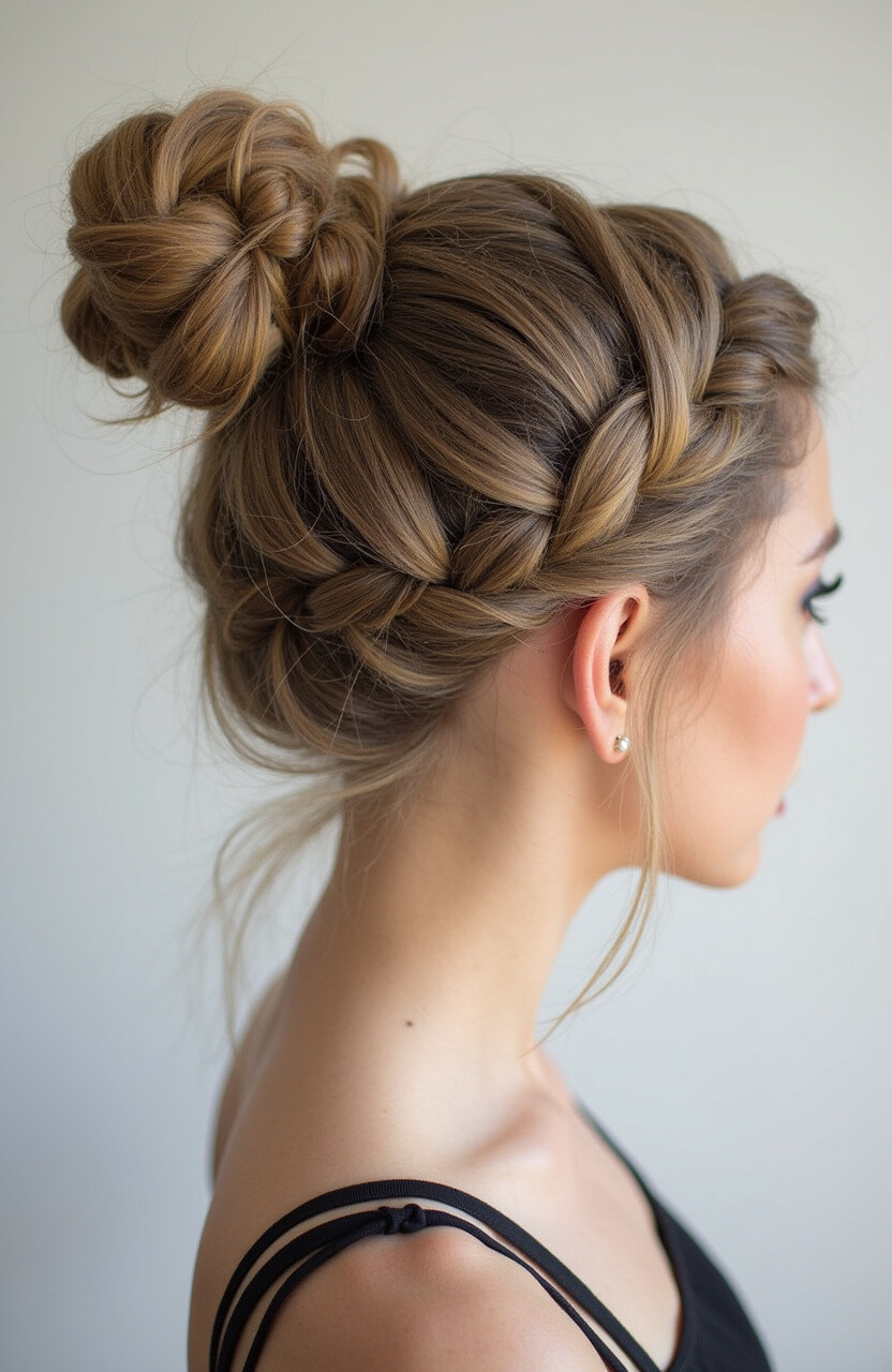 This style combines the classic bun with intricate braids, offering a textured look that’s both chic and sophisticated.