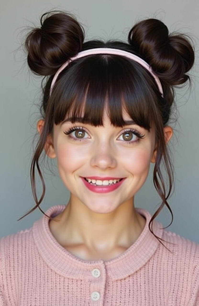 8. Space Buns with Bangs