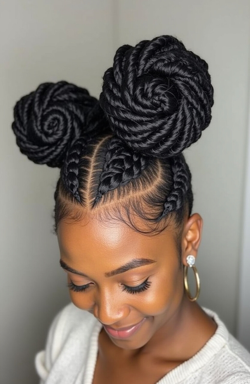 Braid small sections of hair before forming the buns for a unique and eye-catching style. Great for those who love detailed hairstyles.