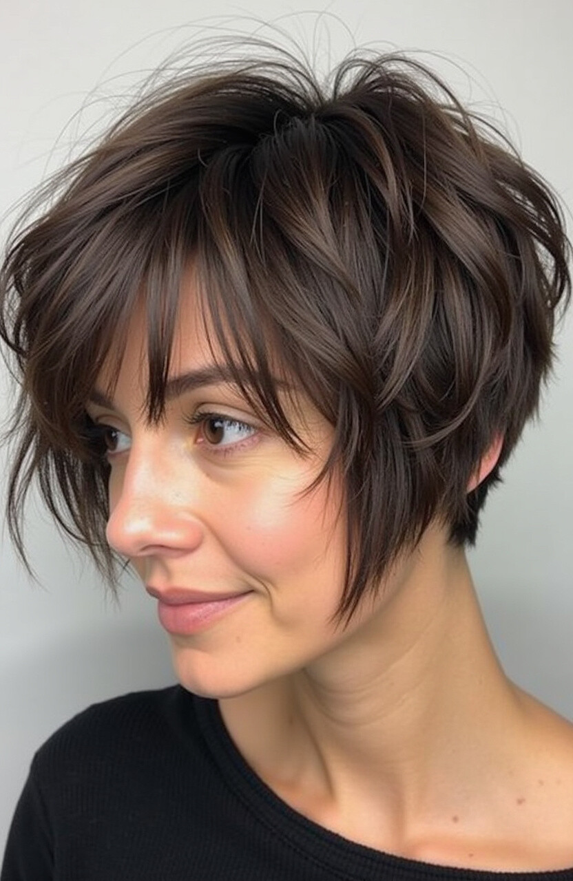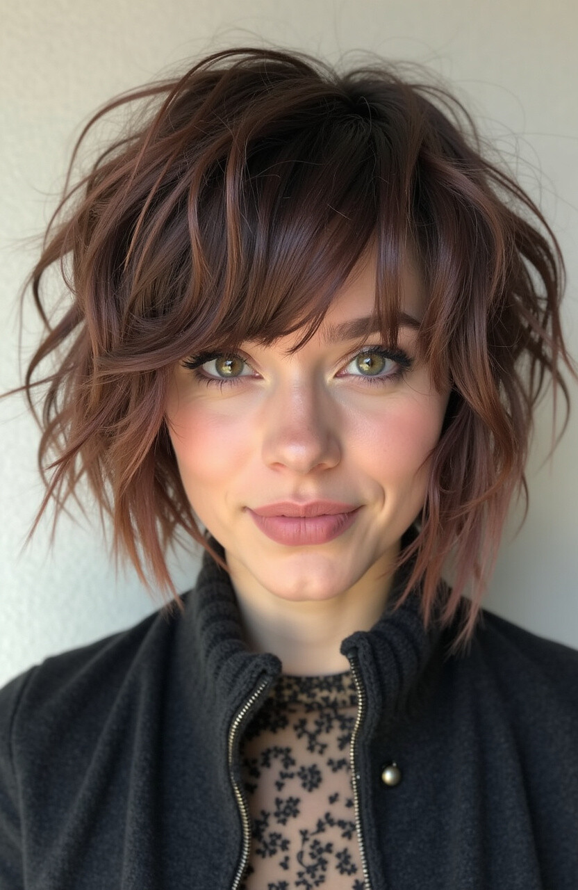 For a fun and edgy vibe, the choppy stacked bob is your go-to. It features uneven layers that create a playful, carefree look.