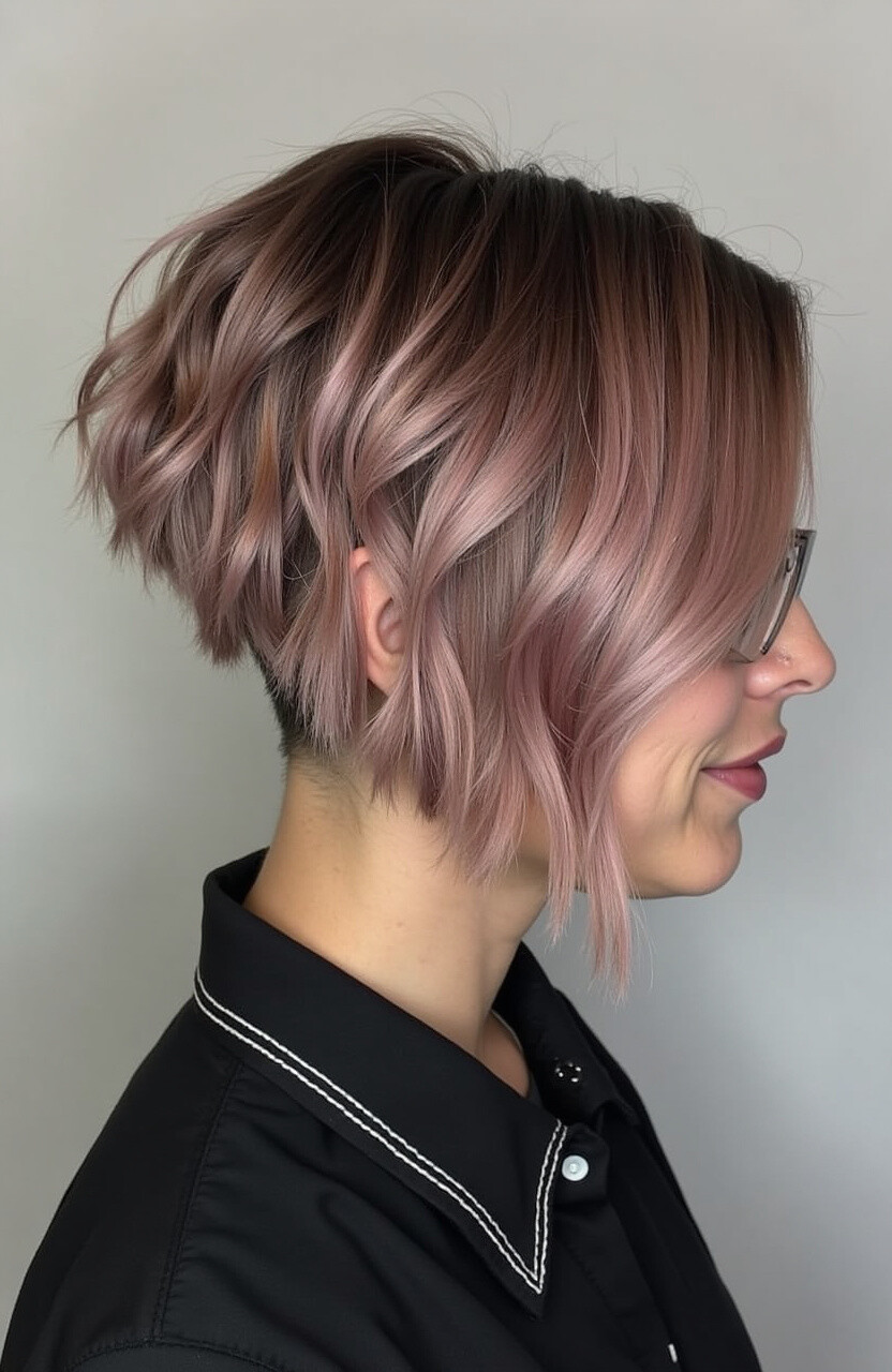 Embrace the bedhead look with a messy stacked bob. It’s carefree, fun, and full of personality.