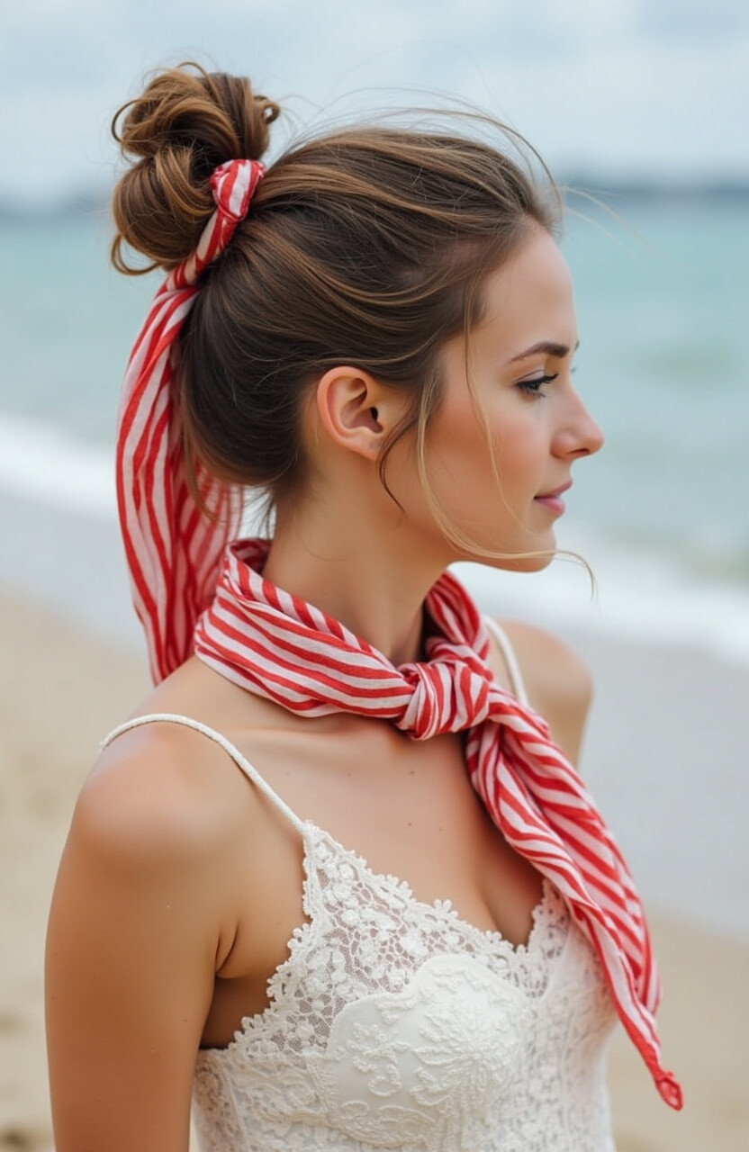Adding a scarf to your twisted bun brings a pop of color and style. It’s perfect for summer days or beach outings.