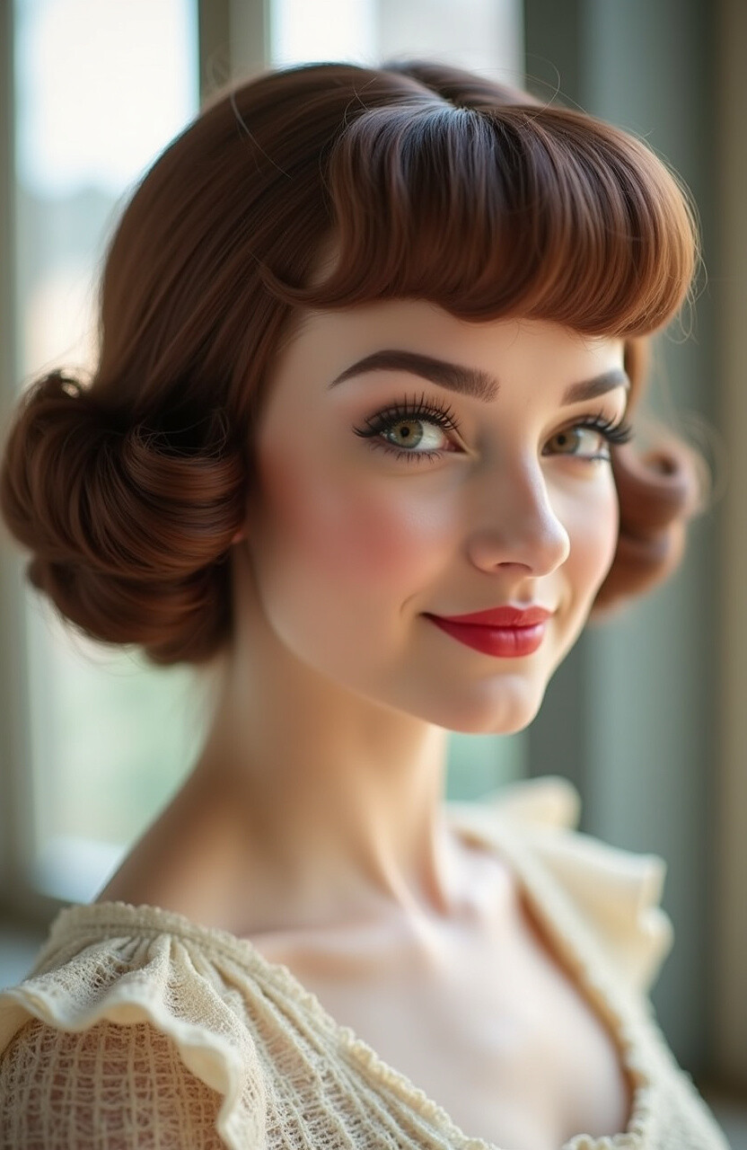 The bangs add a playful and trendy element to the victory rolls. It’s unique because it softens the overall look, making it more approachable. Style your bangs to the side or straight for different effects.