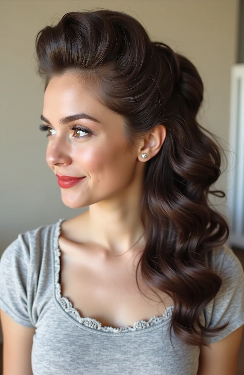 The ponytail adds a modern twist to the traditional victory rolls. It’s unique because it combines two different eras of style into one cohesive look. Add a hair ribbon or a fun scrunchie for an extra pop of personality.
