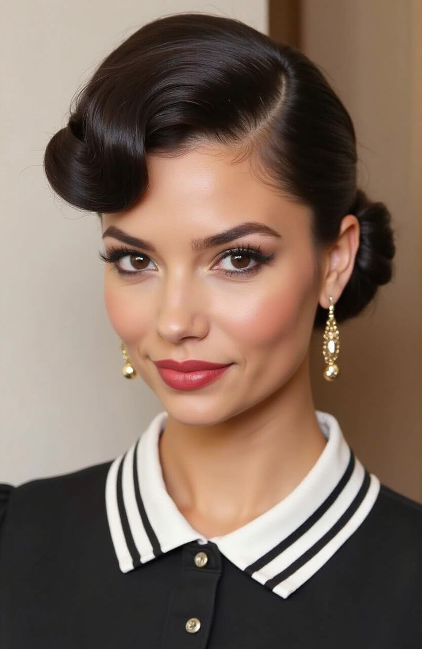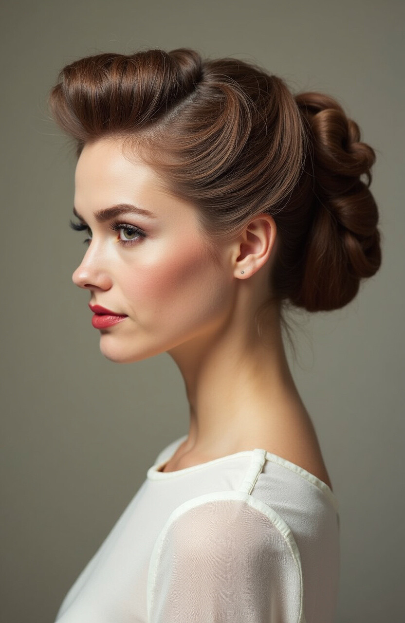 The chignon provides an elegant base for the victory rolls, making this style unique and refined. It’s perfect for weddings, galas, or any occasion where you want to look your best. Try adding some decorative pins for extra flair.
