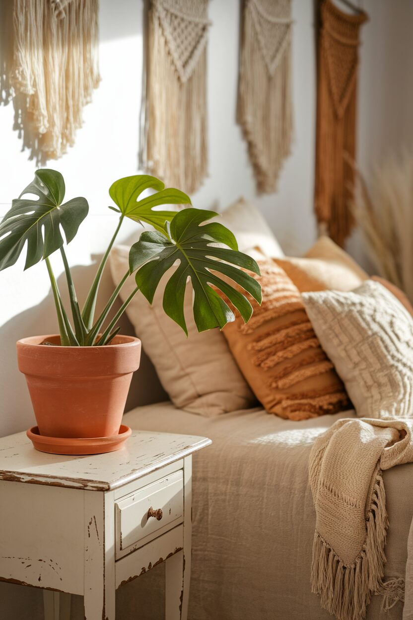 Plants are an essential part of the boho aesthetic. They bring life and a splash of green into your room. Choose easy-to-care-for varieties like succulents or snake plants.