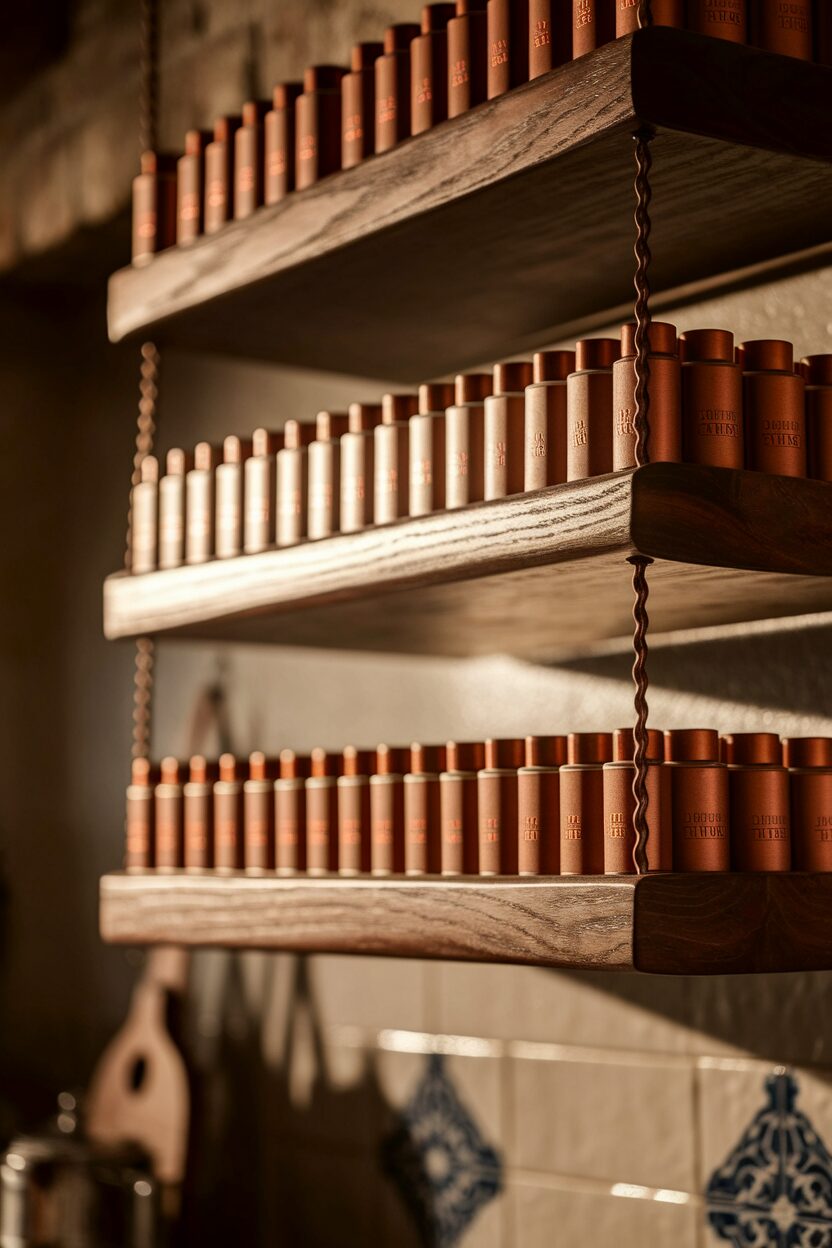 Maximize kitchen space by installing floating shelves as a spice rack. Arrange jars of spices for easy access and a pop of color. It’s practical and adds a gourmet touch to your kitchen.