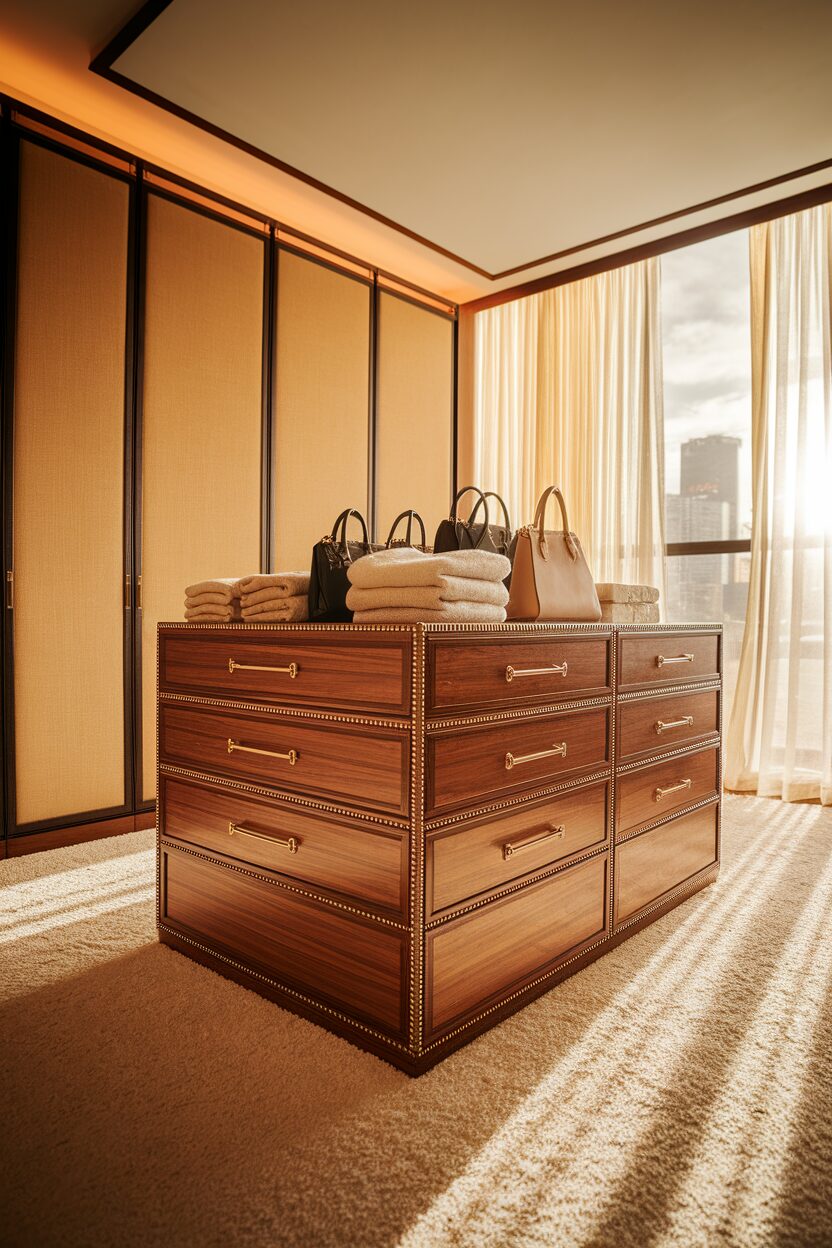 An island with drawers is a perfect way to add more storage. It provides an additional surface for folding clothes or displaying accessories.