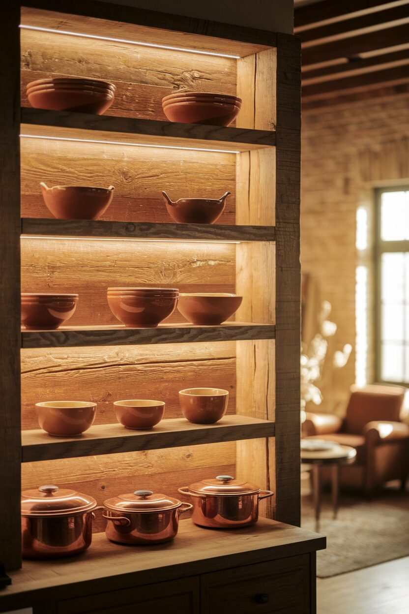 Add a touch of luxury with copper shelves. Their warm, metallic hue is eye-catching and elegant, perfect for a sophisticated kitchen.