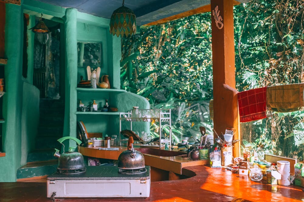 For a nautical or bohemian vibe, try hanging rope shelves. They add a casual, laid-back feel to your kitchen.
