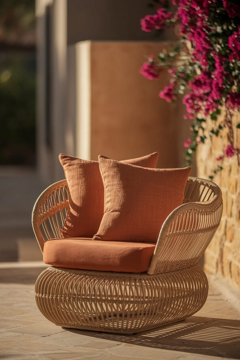 A cozy blanket draped over the arm of your chair can add warmth and texture. It’s a simple way to dress up your rattan chair while also being functional.