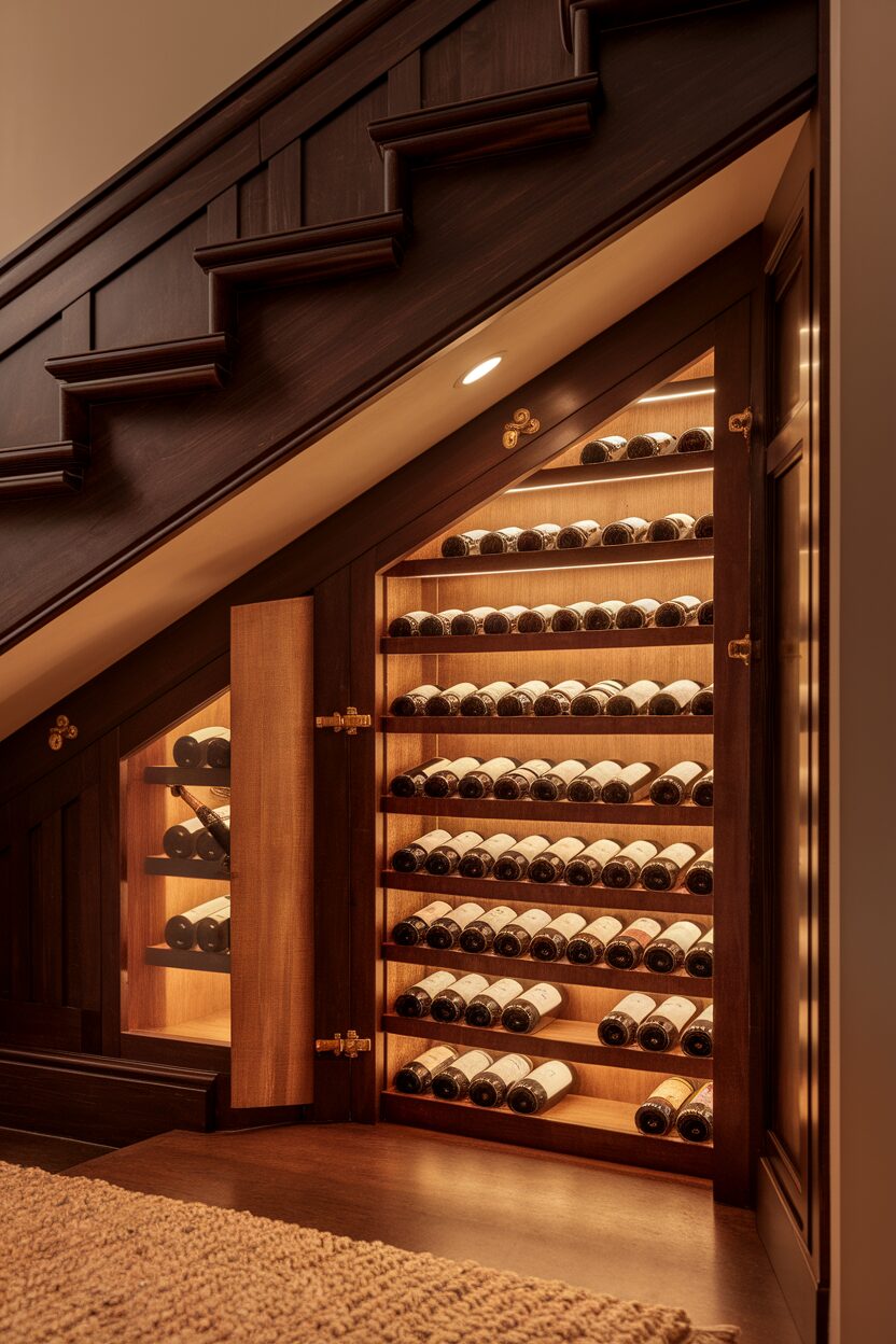 For wine lovers, an under-stair wine rack is an enchanting idea. Imagine sliding open a panel to reveal your private collection of reds and whites. It’s like a little secret just for you, and maybe your guests!