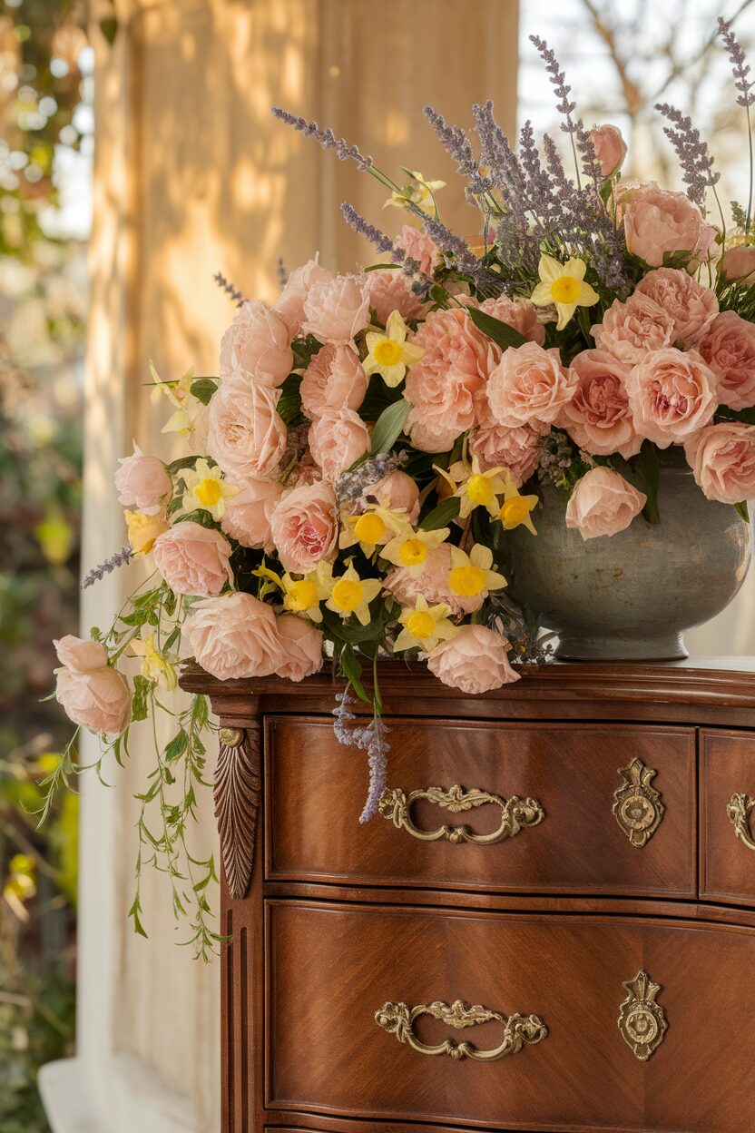 A vase of fresh flowers on your dresser instantly brings life and color to the room. The natural beauty of flowers complements the vintage wood.