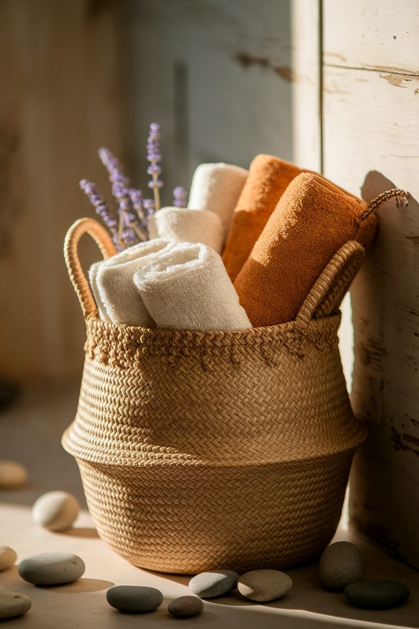 Imagine stepping into a bathroom where towels are neatly rolled in a woven basket, creating a spa-like vibe. The natural texture of the basket adds warmth and coziness. It’s not just about storage; it’s about creating a relaxing atmosphere.