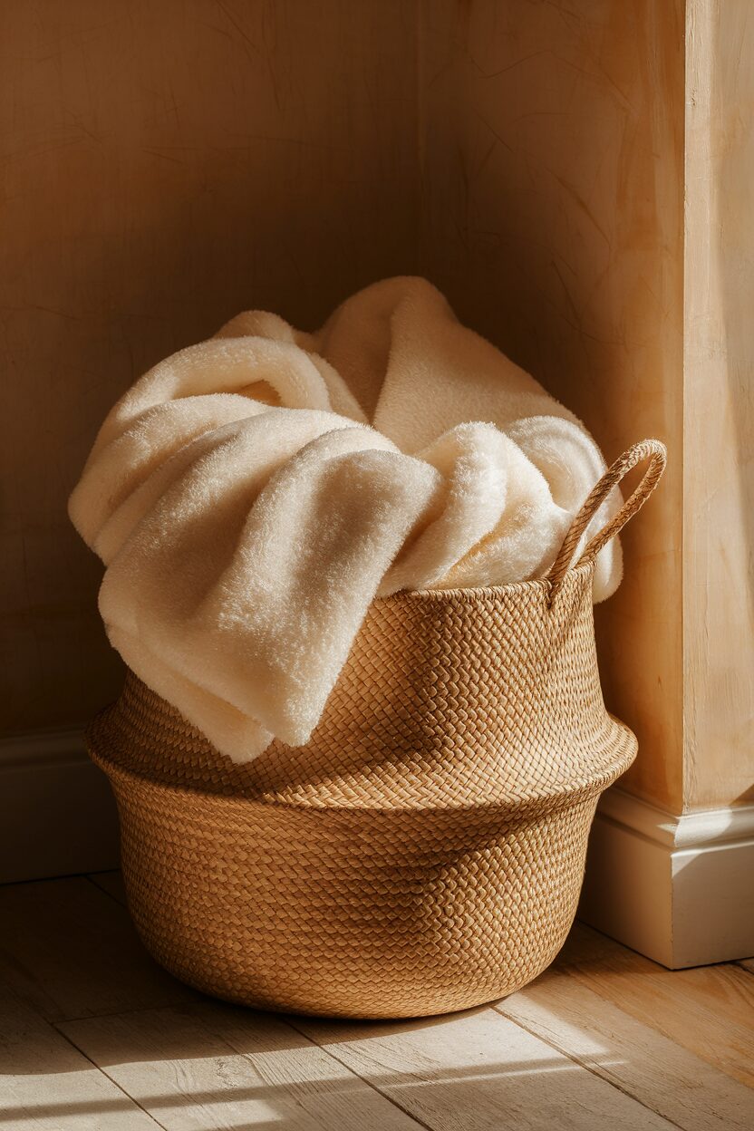 Create a calming bedroom environment with woven baskets to store extra pillows, books, or bedtime essentials. It’s a simple way to maintain a clutter-free space.