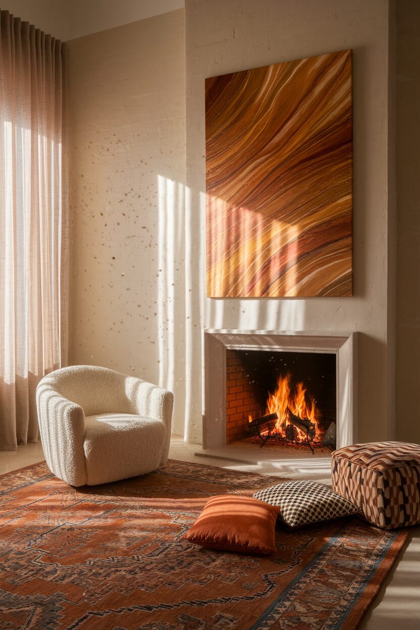 Mixing textures around your fireplace adds depth. Think soft throws, woven baskets, and smooth ceramics.