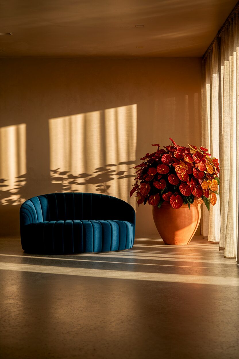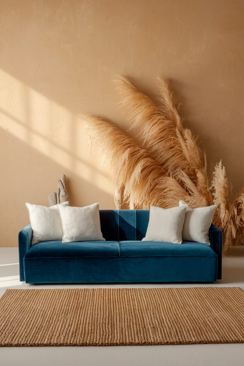Your blue sofa will feel grounded, creating a natural and inviting space.