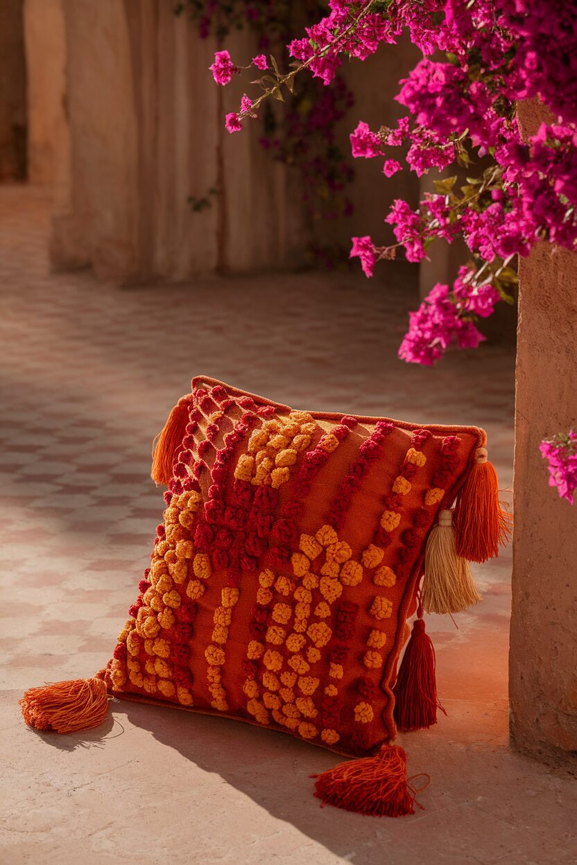 This cushion is a canvas of creativity, with abstract patterns and vibrant tassels that make a bold statement. It’s perfect for art lovers who want to express their unique style.