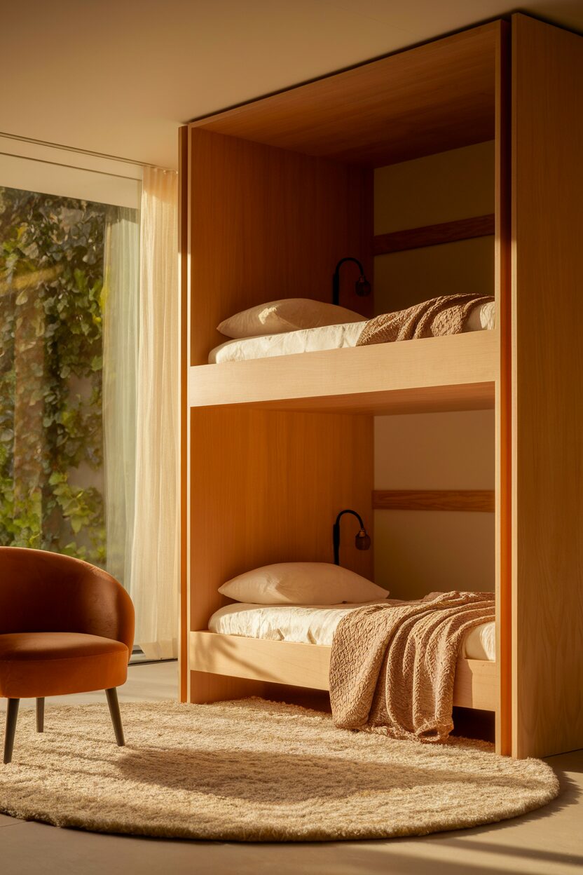 Embrace the simplicity and warmth of a cozy Scandinavian bunk room. Use neutral tones, natural materials, and minimalist decor for a serene space. Soft textiles and warm lighting enhance the hygge vibe.