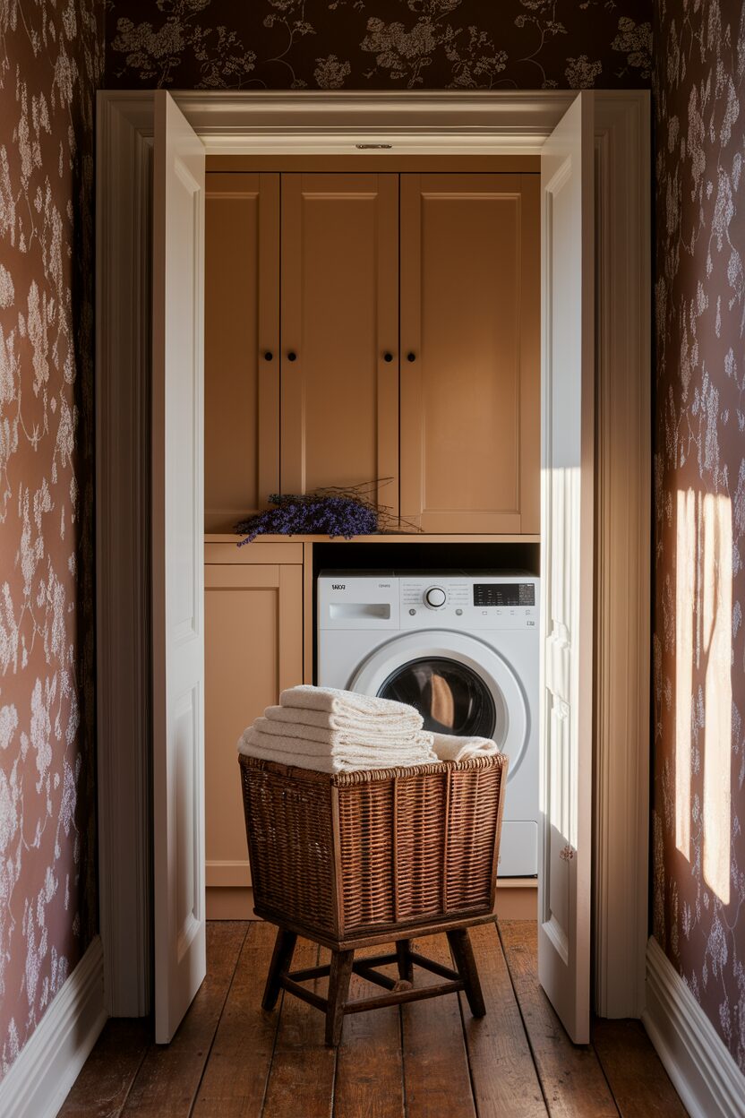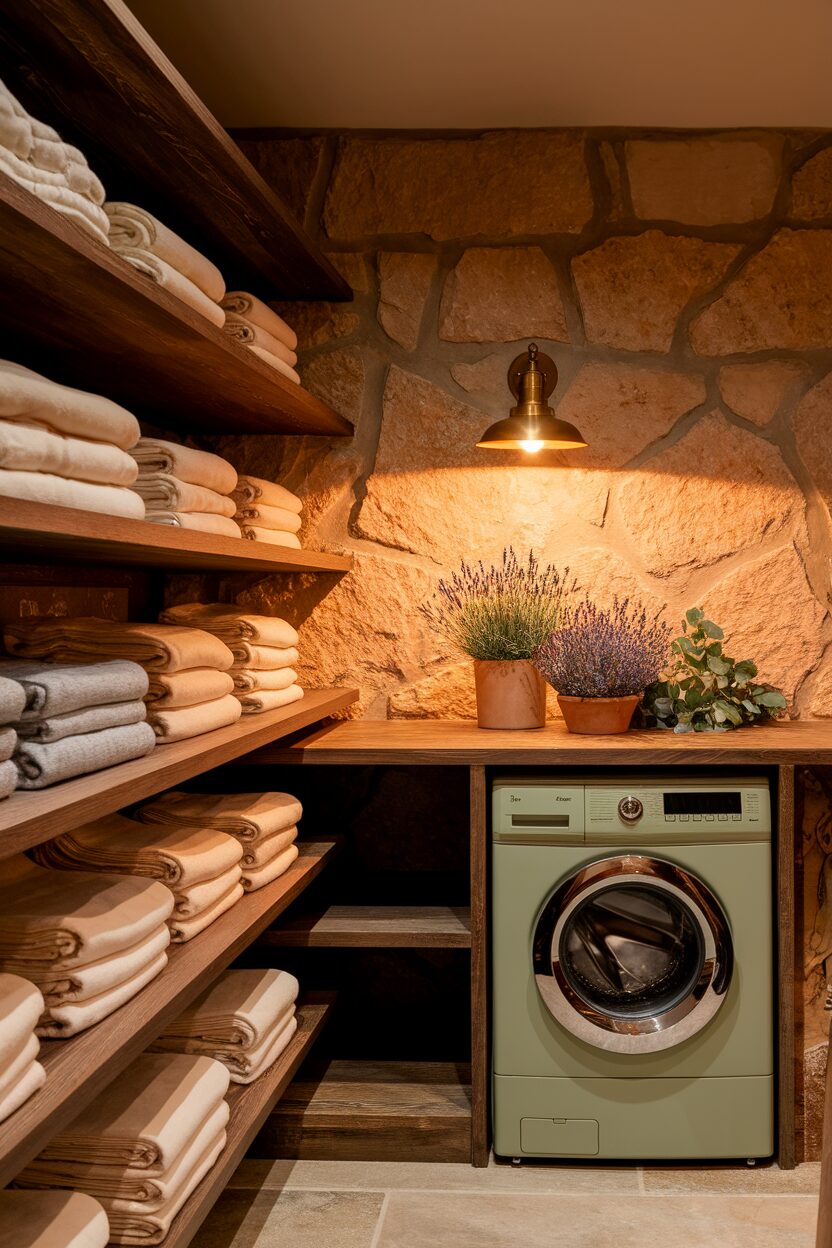 Embrace a rustic vibe with wooden shelves and metal baskets. The natural wood tones bring warmth, making laundry day feel cozy. Install an antique light fixture for extra character.