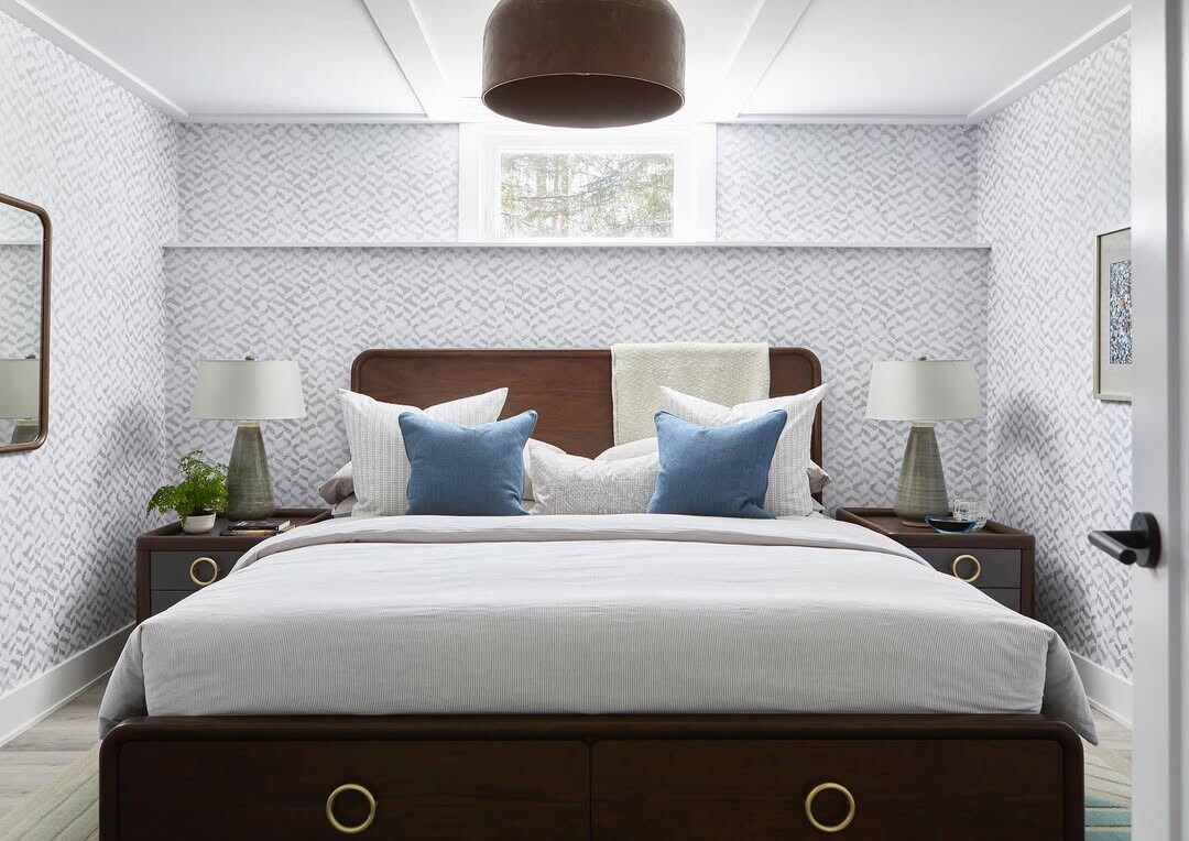 Layering textures adds interest too. Gray wallpaper contrasts with dark wood. Light enhances the room’s feel. Overall, this image showcases harmony in bedroom design, blending elegance with simplicity. Creating inviting spaces is essential for relaxation.