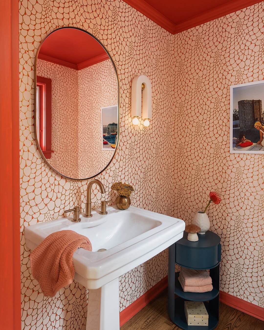 Wallpaper features circular motifs in peach and orange. Patterns add depth and dimension. They uplift the space, making it feel lively and inviting.