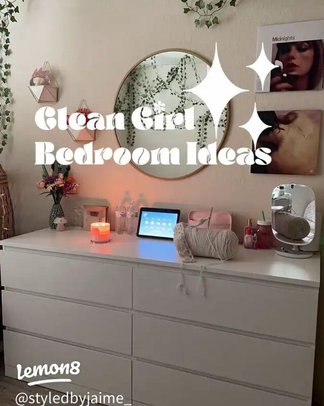 Stylish, organized bedroom. Dresser shines with elegance. A round mirror reflects light, enhancing space. Decorative plants add life. Greenery promotes calmness and freshness. Candles provide warmth and relaxation, perfect for unwinding. Skincare products signal self-care importance. They represent a growing trend toward wellness and beauty routines. Small electronic tablet shows tech integration in daily life. It suggests balance between modernity and simplicity. “Clean Girl Bedroom Ideas” theme stands out boldly. This concept resonates with minimalism and functionality. Clean lines create a serene atmosphere. Each element has purpose. Together, they illustrate a lifestyle focused on beauty, organization, and mental well-being. A perfect mix of style and practicality.