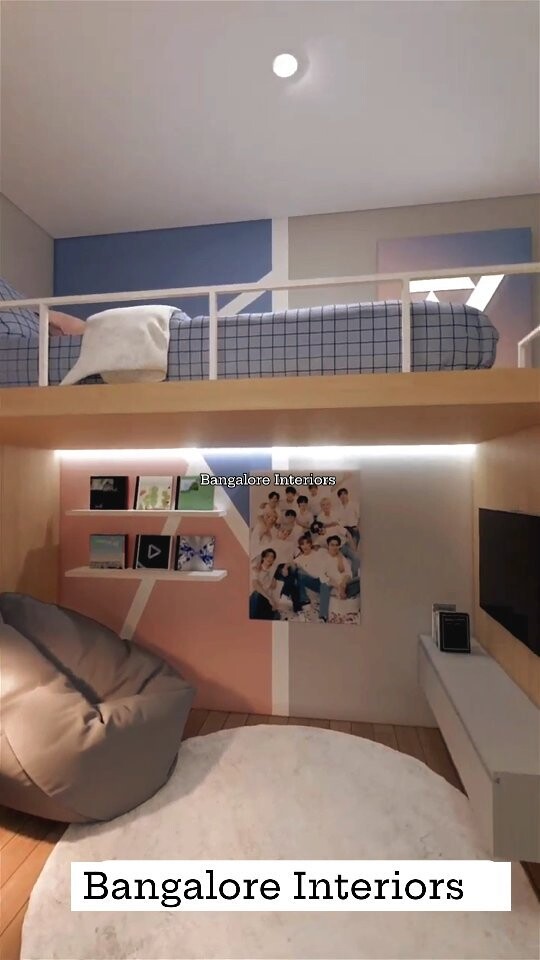 Stylish bedroom design shines here. Lofted bed creates space. Blue and white checkered comforter adds a fun touch. Cozy beanbag chair invites relaxation. Soft rug underfoot keeps things warm.