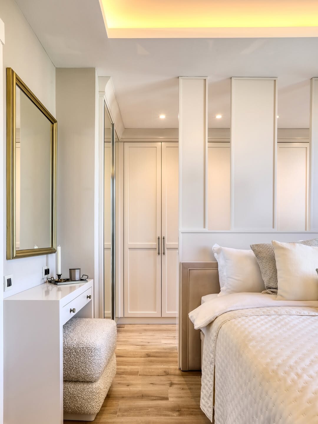 Modern elegance shines in this bedroom. Plush bed invites comfort. Soft pillows add warmth and coziness. Mirrored wardrobe enhances light. It creates an illusion of space. Minimalist vanity table keeps it simple. Cozy ottoman offers extra seating. Ambient lighting sets a soothing mood. Warm wood flooring adds a touch of nature. Muted colors create calmness, promoting relaxation.