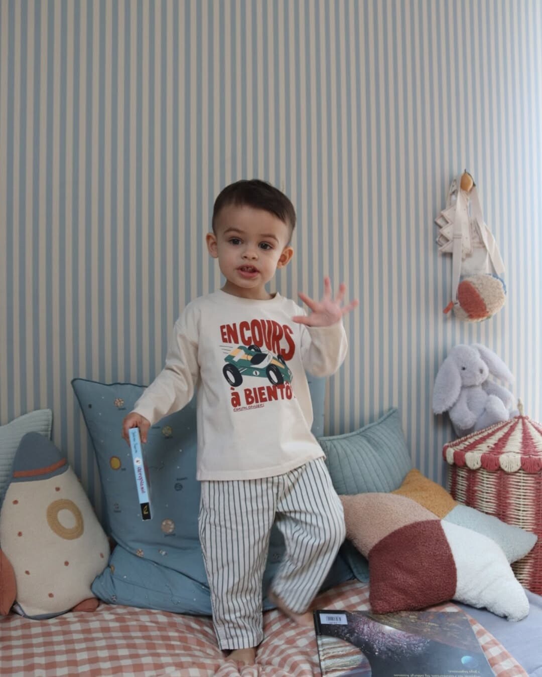 A young child with light brown hair captures joy. Wearing a cream shirt with “EN COURS À BIENTÔT,” the text suggests learning and anticipation. Striped pajama pants add a playful touch. Cozy bed filled with colorful cushions invites comfort and creativity. Holding a book, the child embraces literacy, a foundation for growth. Waving signifies a connection, perhaps to friends or family.