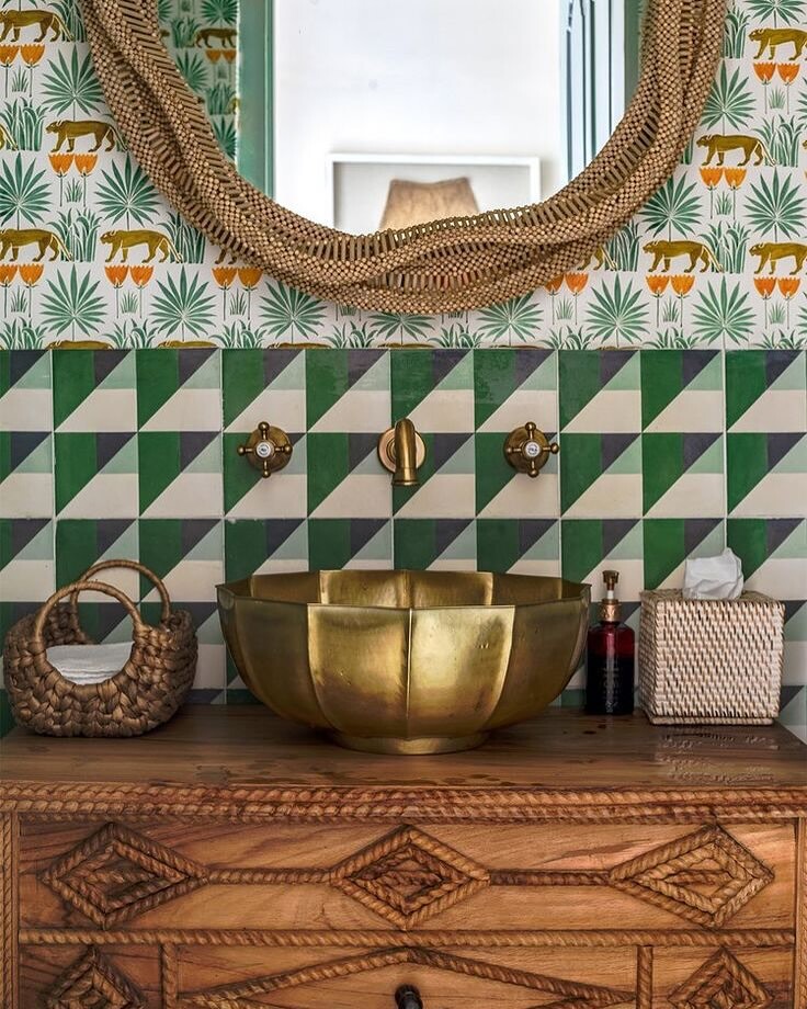 Stylish bathroom vanity shines. Floral and geometric backsplash adds charm. Patterns blend well. Golden bowl sink steals attention. Its elegance stands out against wooden cabinet. Textured wood brings warmth and earthiness. Accessories enhance visual interest. Woven basket introduces texture. Minimalist container keeps it simple. Large, intricately woven mirror expands space visually. Mirrors are essential in small areas. They reflect light and create depth. Color choices here are vibrant yet harmonious. This design reflects a trend toward mixing styles. Modern meets rustic. Each element connects to broader ideas of functionality and aesthetics. Bathrooms evolve as personal retreats. They balance beauty and utility. Overall, this setup showcases smart design choices. It invites relaxation and inspires creativity.