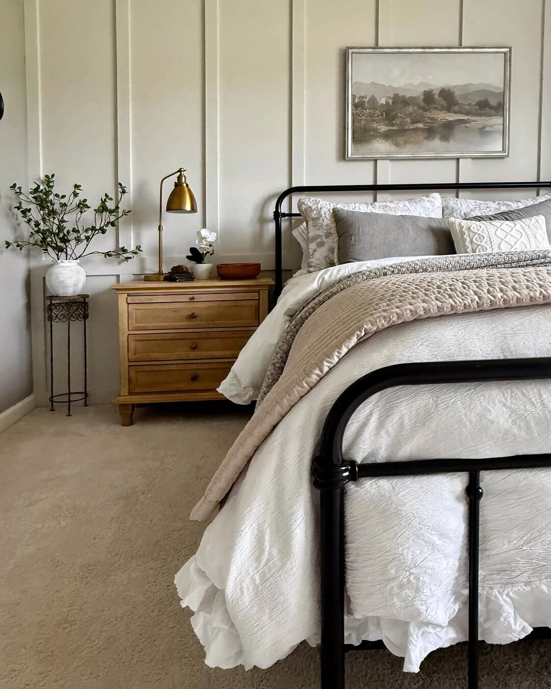 Serene bedroom design shines here. Black metal bed frame stands strong. Light-colored bedding softens the look. Textured throw adds warmth. Wooden nightstand brings nature indoors. A decorative plant breathes life into space. Lamp offers cozy lighting. Softly painted walls create calmness. Framed landscape painting enhances ambiance. Art connects to nature, promoting relaxation.