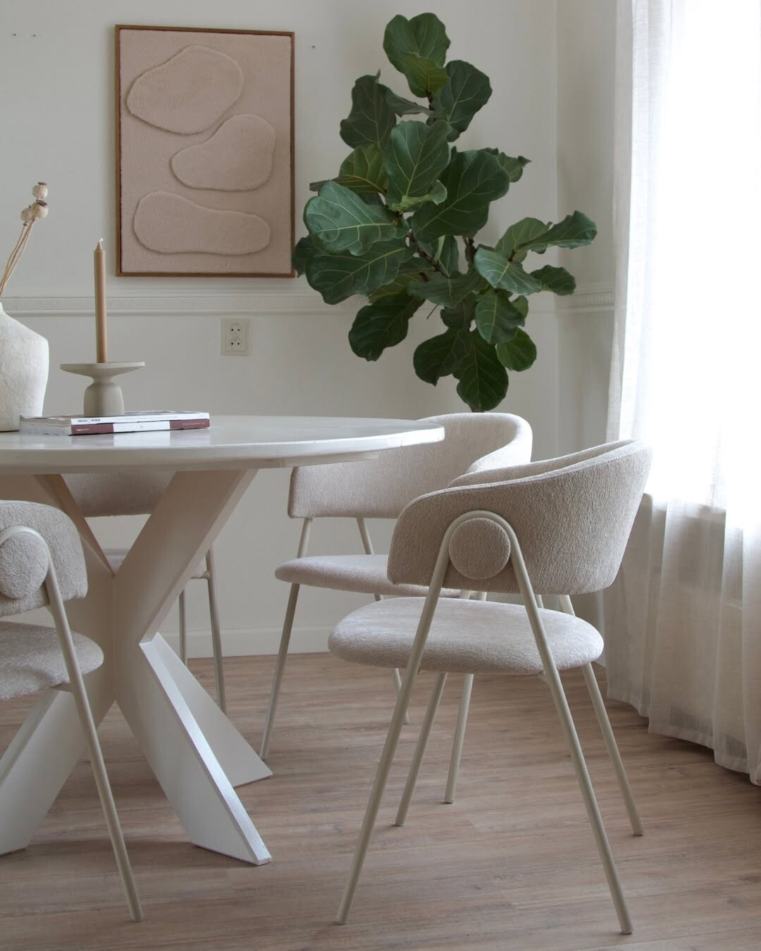Minimalist design shines in this dining area. Round white table stands out. X-shaped base adds interest. Soft, upholstered chairs invite comfort. Rounded backs create a cozy feel. A tall fiddle leaf fig plant brings life. Green hues contrast nicely with earthy tones in wall art. Light wood flooring warms the space. Natural light filters through sheer curtains, enhancing brightness.